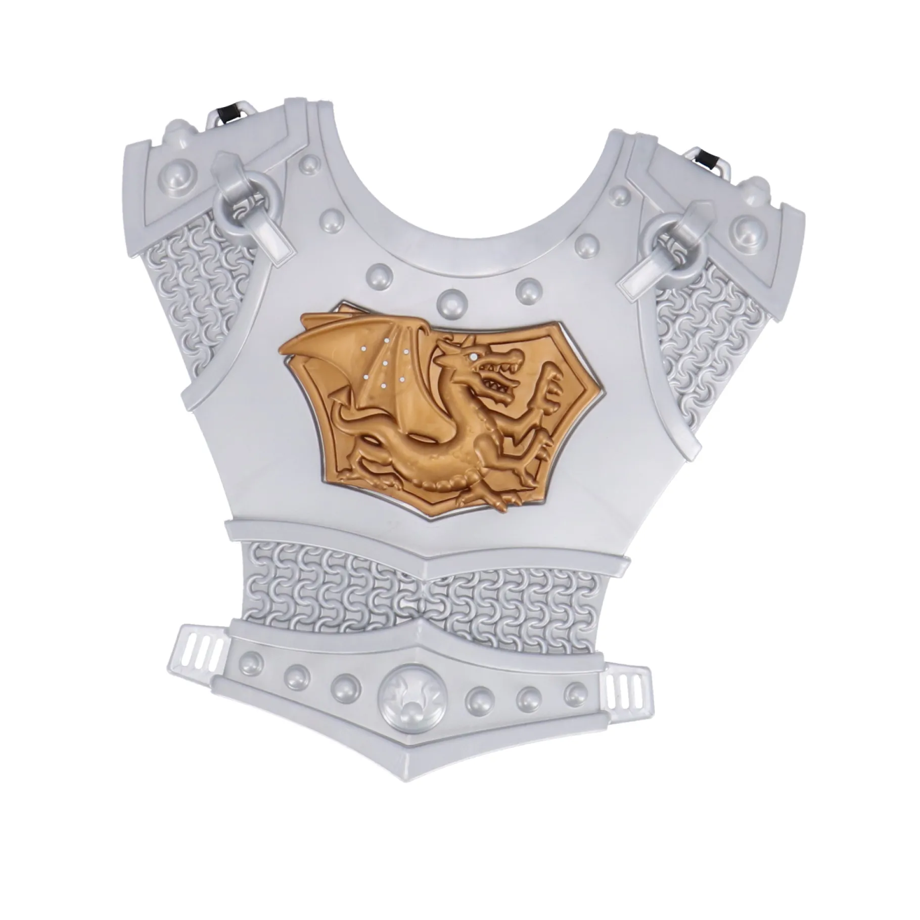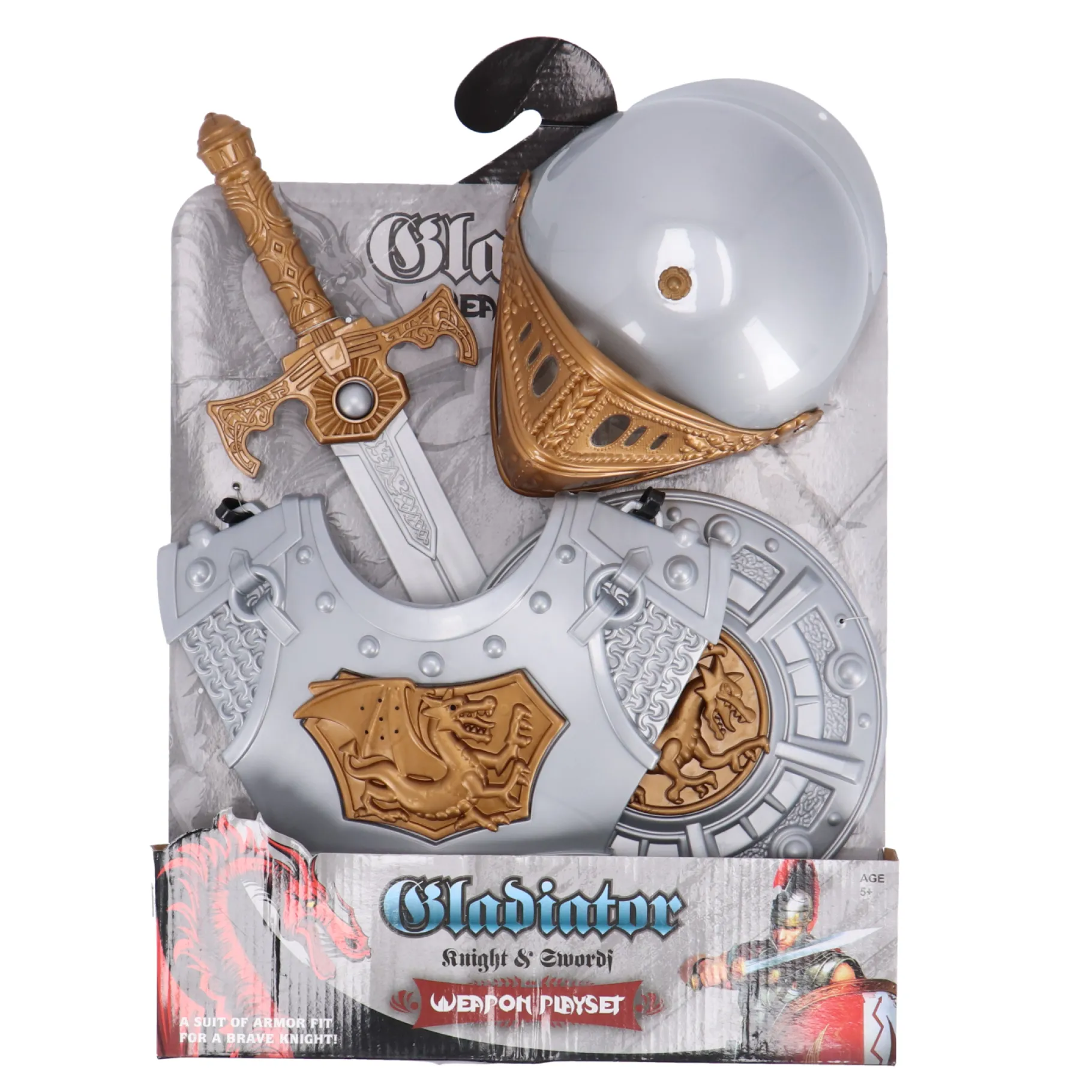 De set bestaat uit een stevige helm, een indrukwekkende borstplaat, een machtig zwaard en een schild om jezelf te beschermen. Met deze uitrusting kun je de gevaarlijke draak trotseren en de prinses (of prins!) redden.