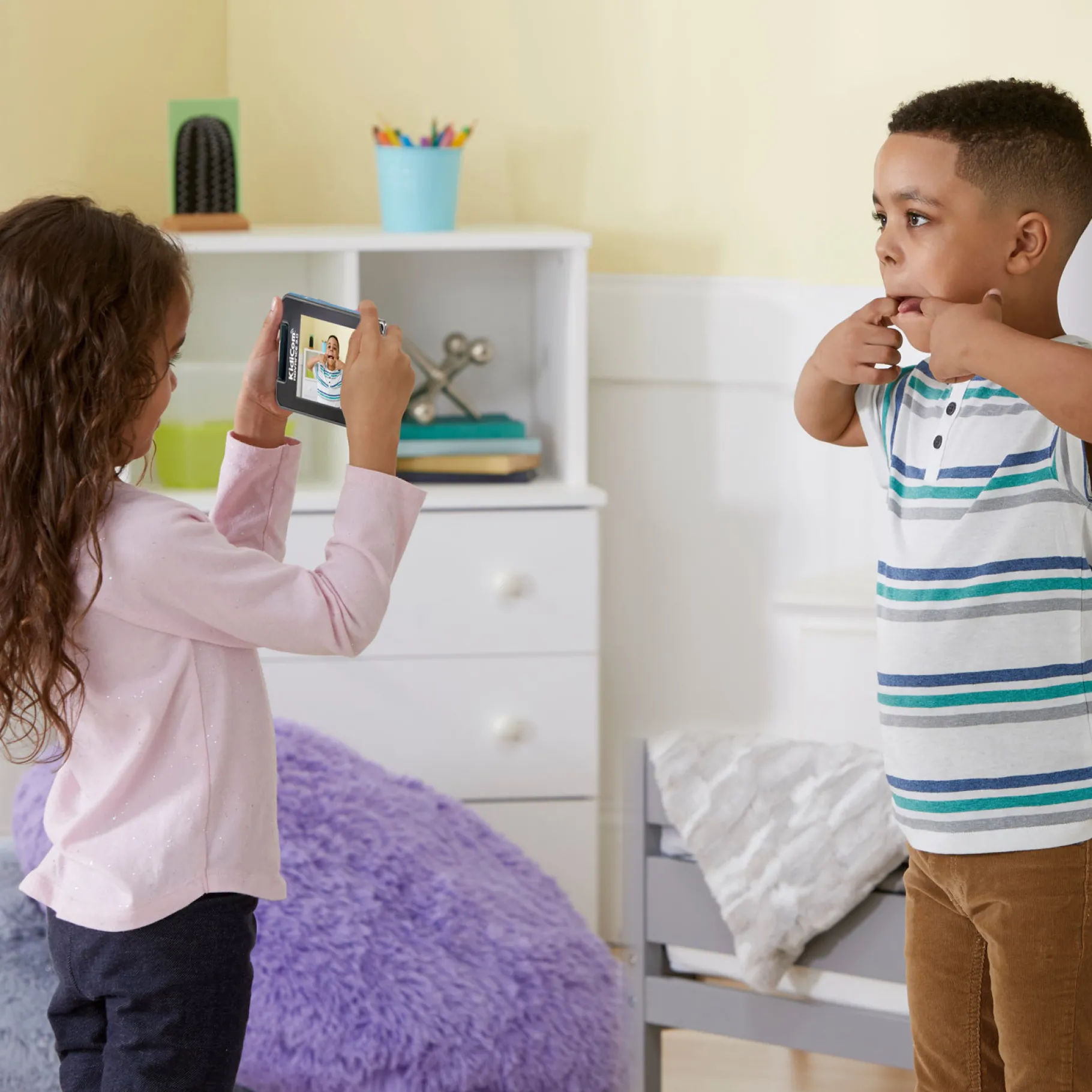 - 180° draaibare cameralens: Met de draaibare cameralens kunnen kinderen zowel stoere selfie’s maken als close-up foto’s met de ingebouwde macrofunctie.