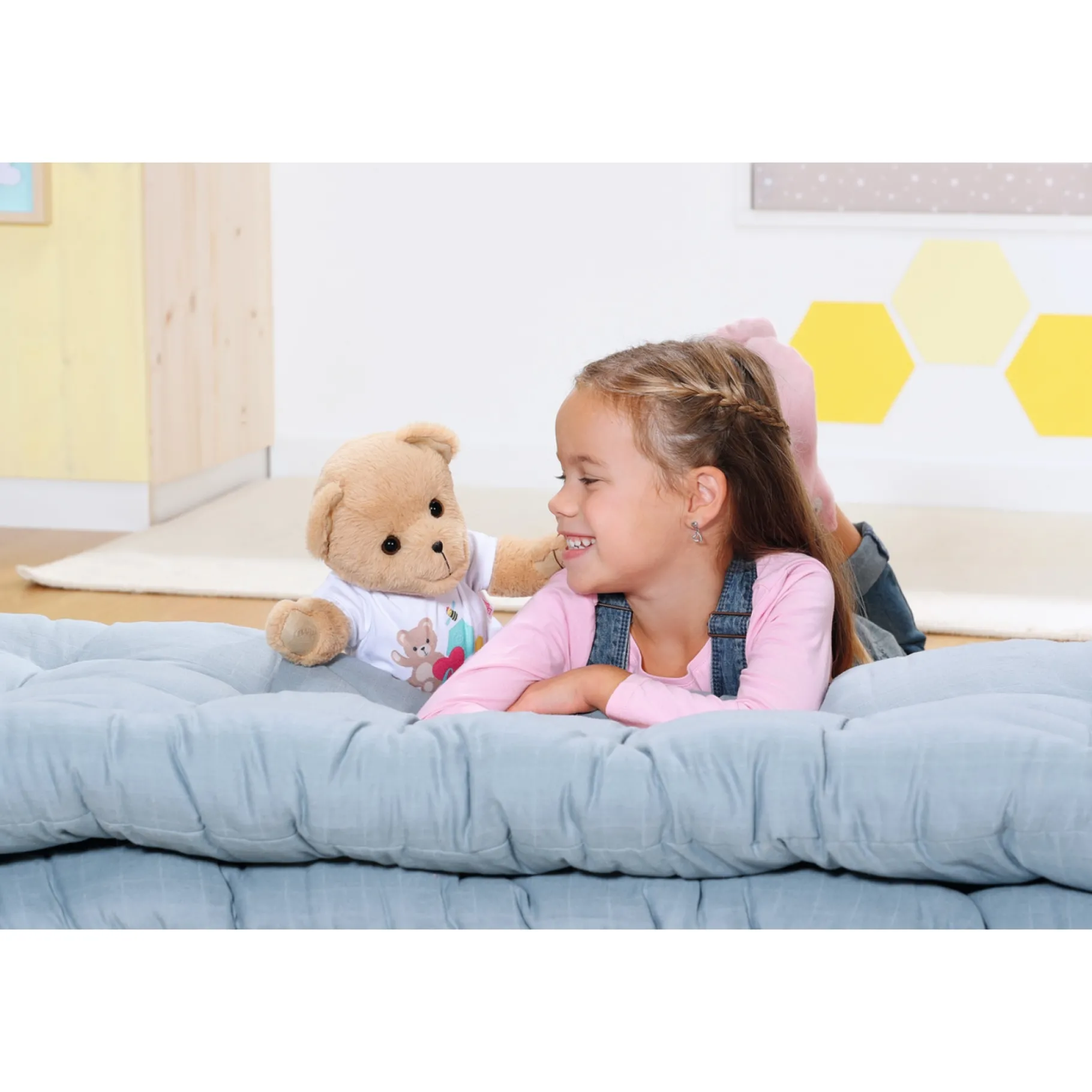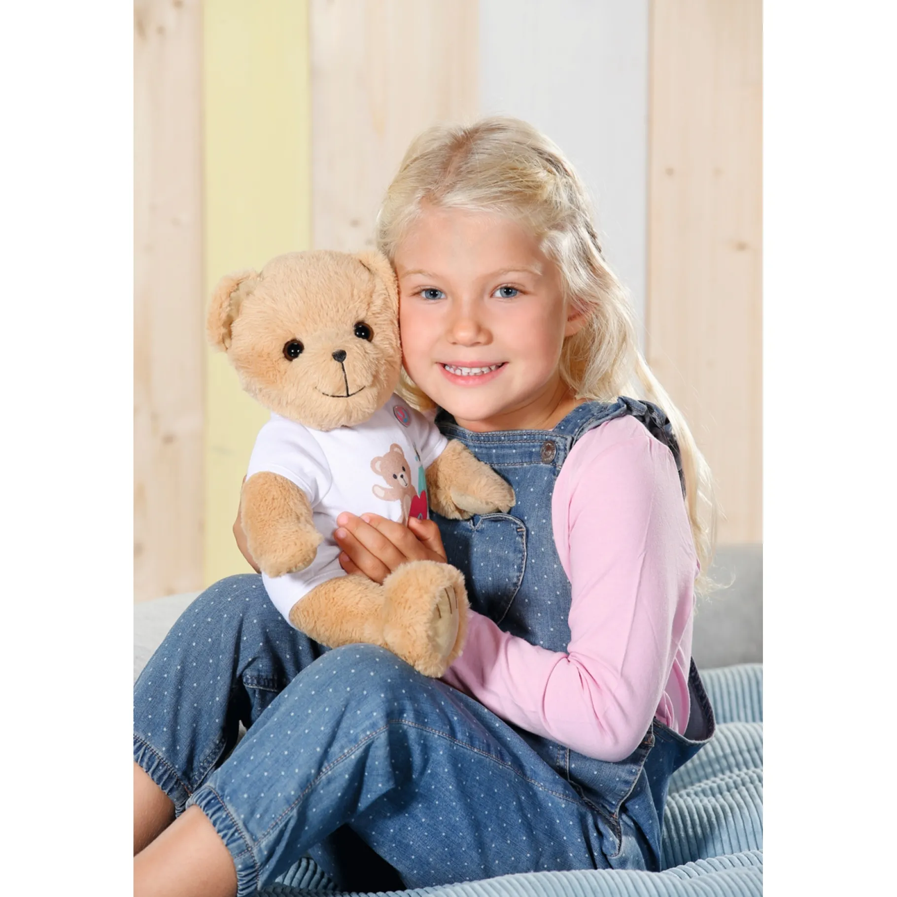 De kleine beer met de lieve glimlach heeft een zacht lichaam van pluche. Zijn eerste outfit is een roze rompertje. De beer heeft zijn eigen outfits en accessoires, maar kan ook bijna alle kleding van de normale BABY born dragen en haar accessoires gebruiken. Het lichaam is zo ontworpen dat bijna alle kleding voor de BABY born-pop van 43 cm de beer past. Doordat de armen en benen flexibel zijn en het hoofd kan draaien, kun je de beer makkelijk aan- en uitkleden. De beweeglijkheid maakt de beer ook perfect voor allerlei spelletjes en rollenspellen. Wie mag er als eerste iets in zijn vriendenalbum schrijven?