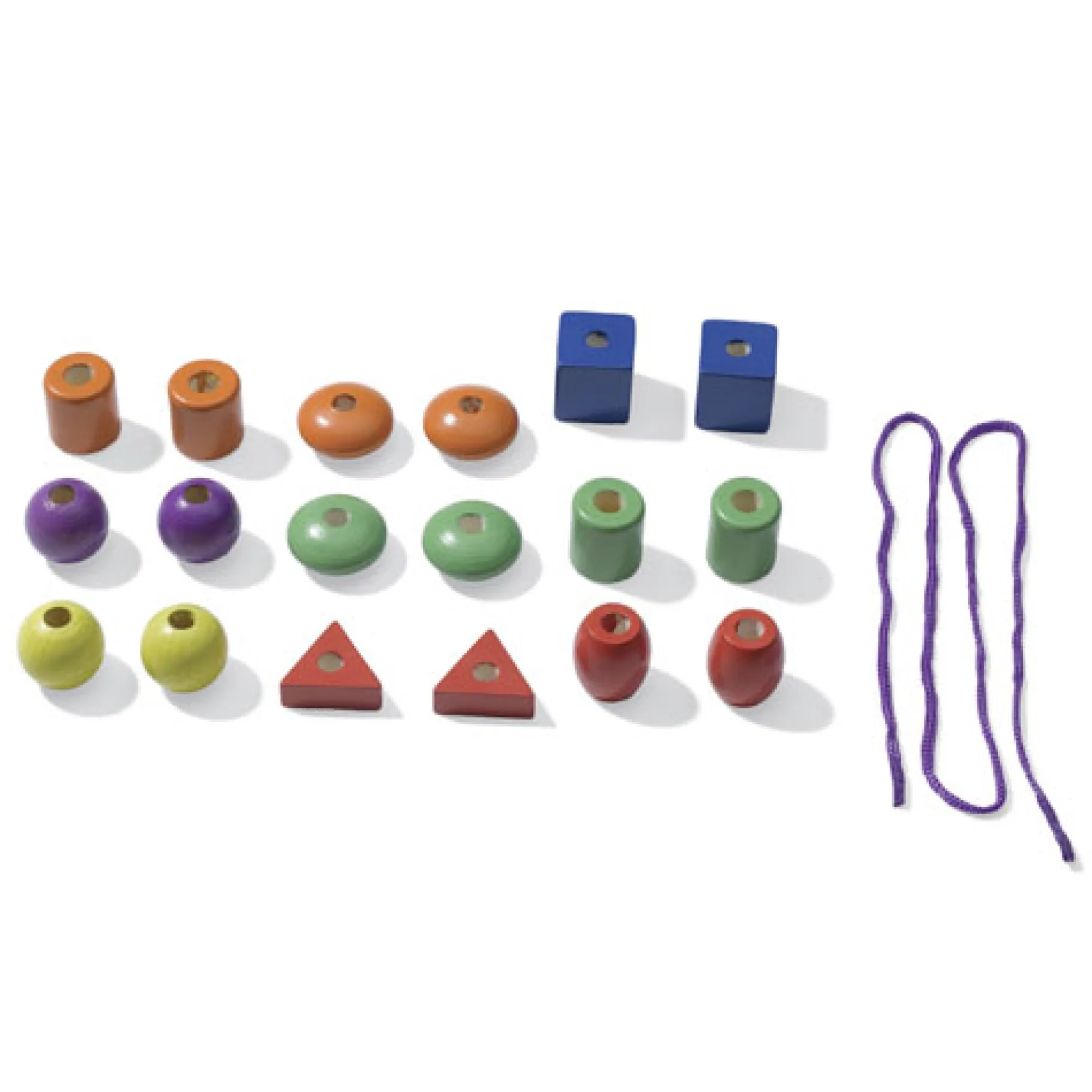 - Achttien vrolijk gekleurde houten kralen in verschillende vormen