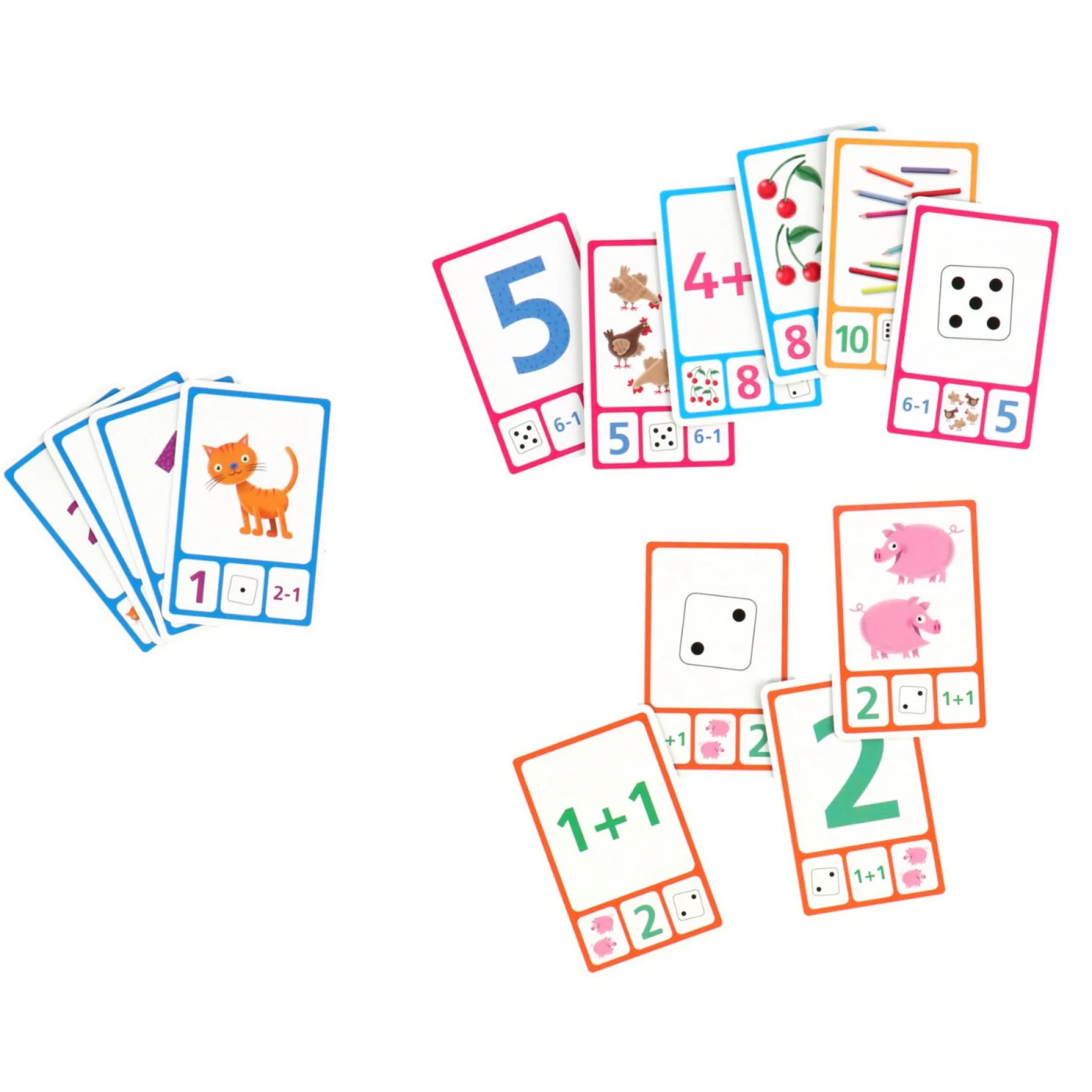 Je hebt van elk setje 4 kaarten, deze vier kaarten hebben het zelfde getal maar op een creatieve, leuke en educatieve manier. Bijvoorbeeld als de kaarten allemaal 1 moeten zijn; heb je een kaart met 2-1 of een kaart met 1 kat. Zo leren kinderen op een spelende wijs.Â