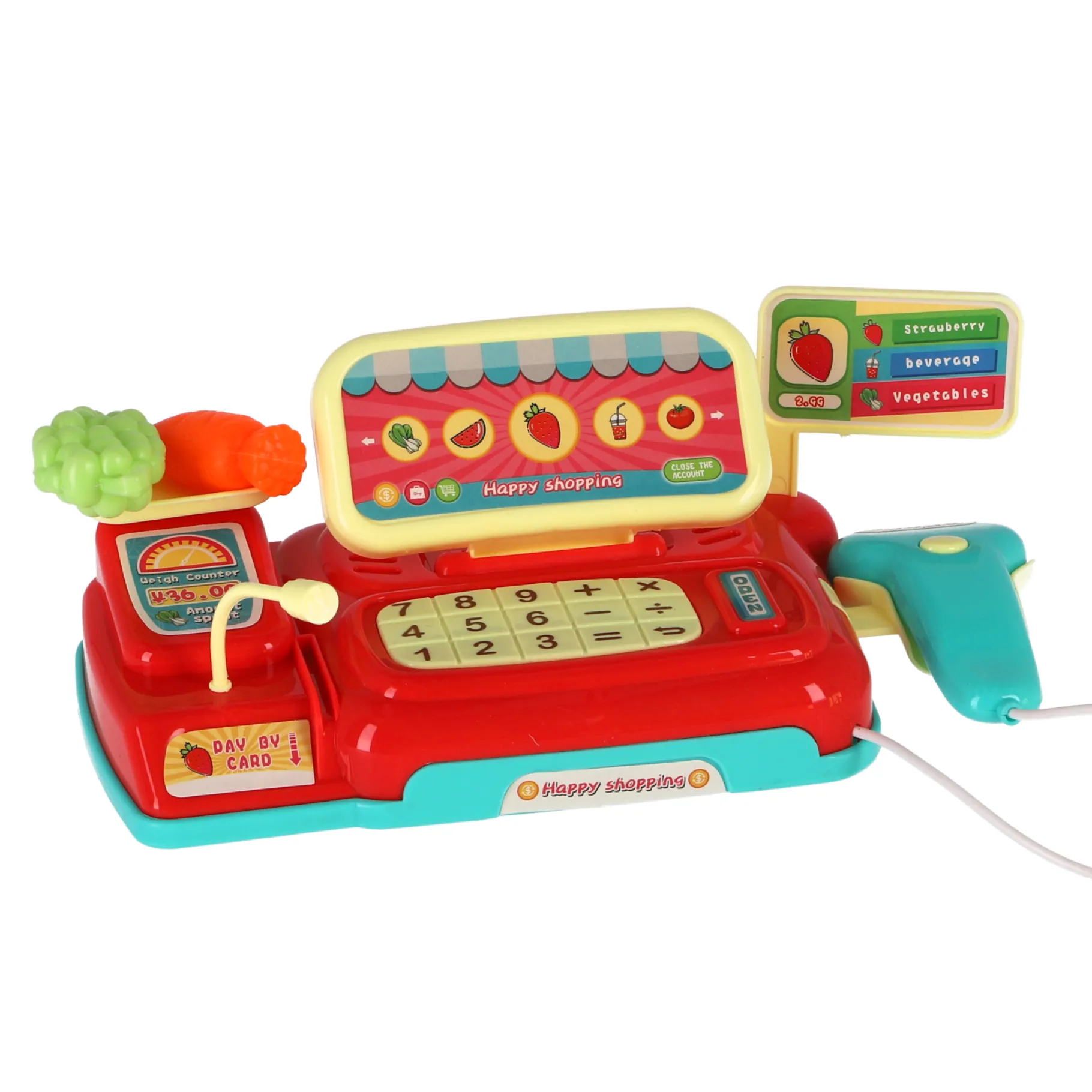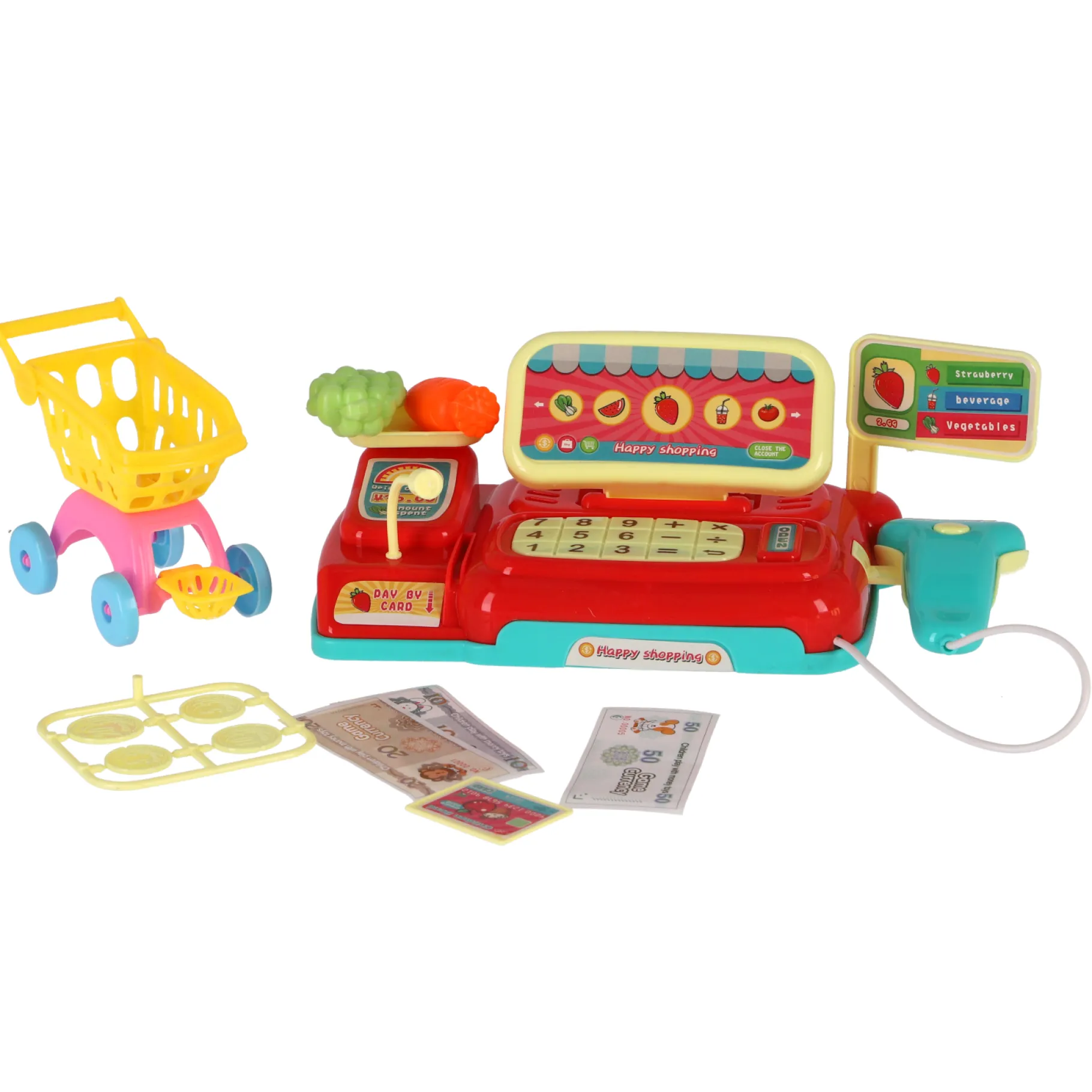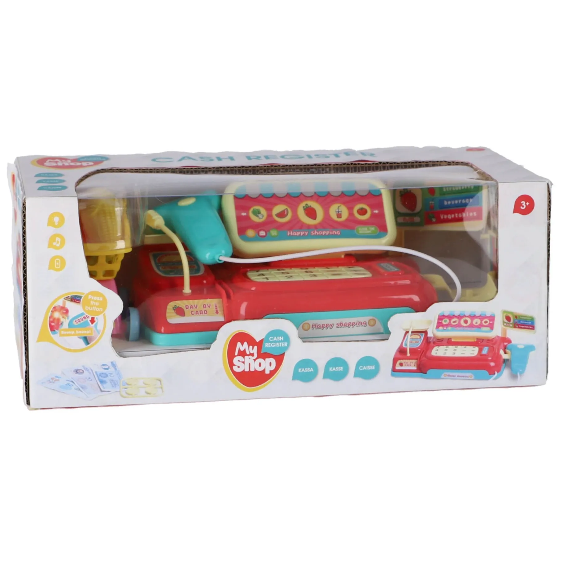Beleef het plezier van winkelen en betalen met onze geweldige speelgoedkassa met licht- en geluidseffecten! Deze kassa is perfect voor kinderen vanaf 3 jaar en biedt een interactieve speelervaring die hun verbeelding stimuleert.
