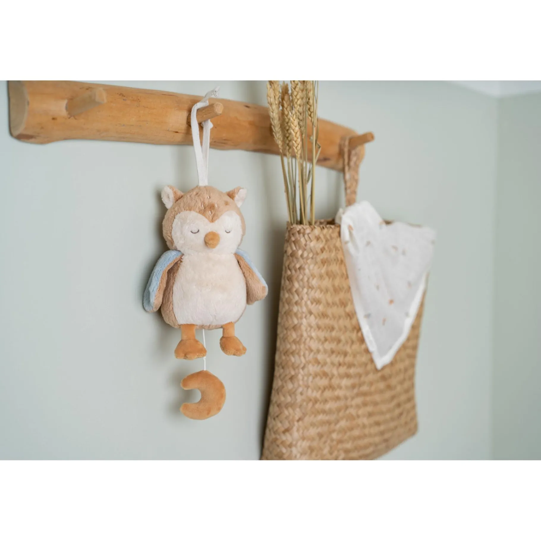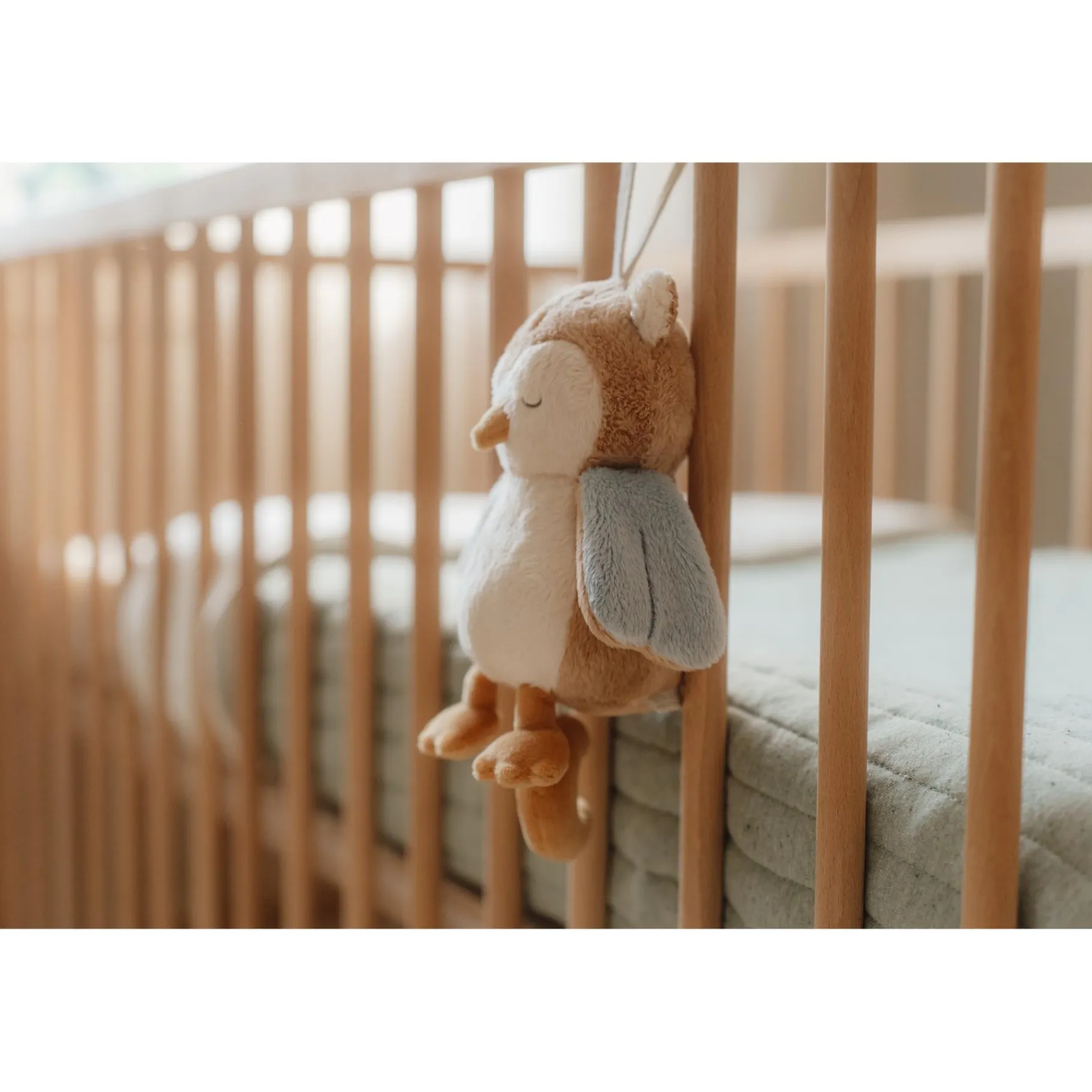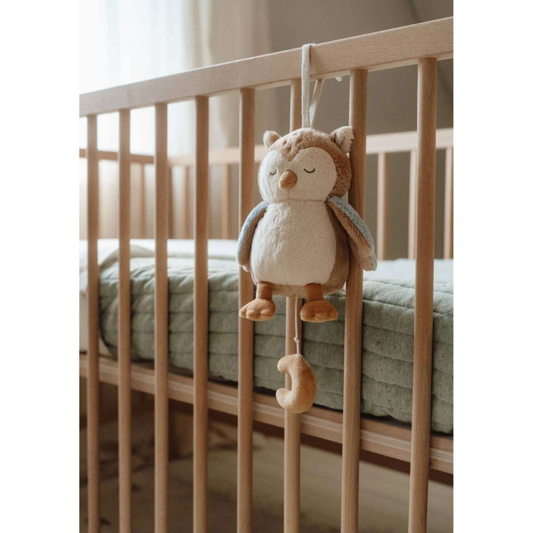 Het eenvoudige trekmechanisme activeert een rustgevend deuntje dat ideaal is om je kleintje in slaap te wiegen of om een moment van rust te creëren. De warme uitstraling van de uil en het subtiele ontwerp passen prachtig in elke kinderkamer, terwijl het compacte formaat ervoor zorgt dat het gemakkelijk mee te nemen is – van de wieg tot de kinderwagen of zelfs onderweg.