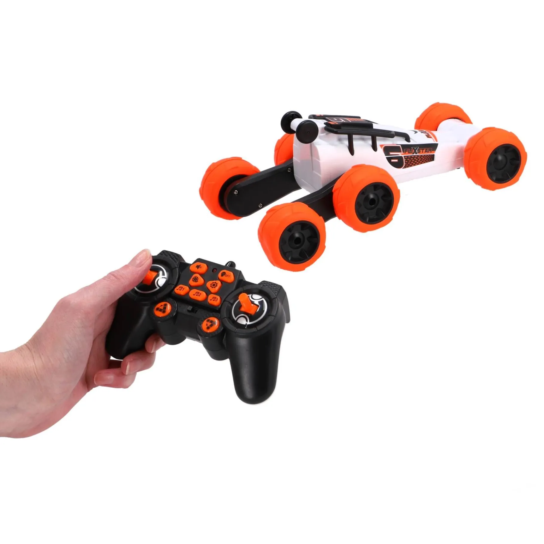 - Stuntmogelijkheden: Dankzij de extra wielen is de Flix Star in staat tot indrukwekkende stunts. Laat hem draaien, kantelen en over obstakels springen voor extra speelplezier.