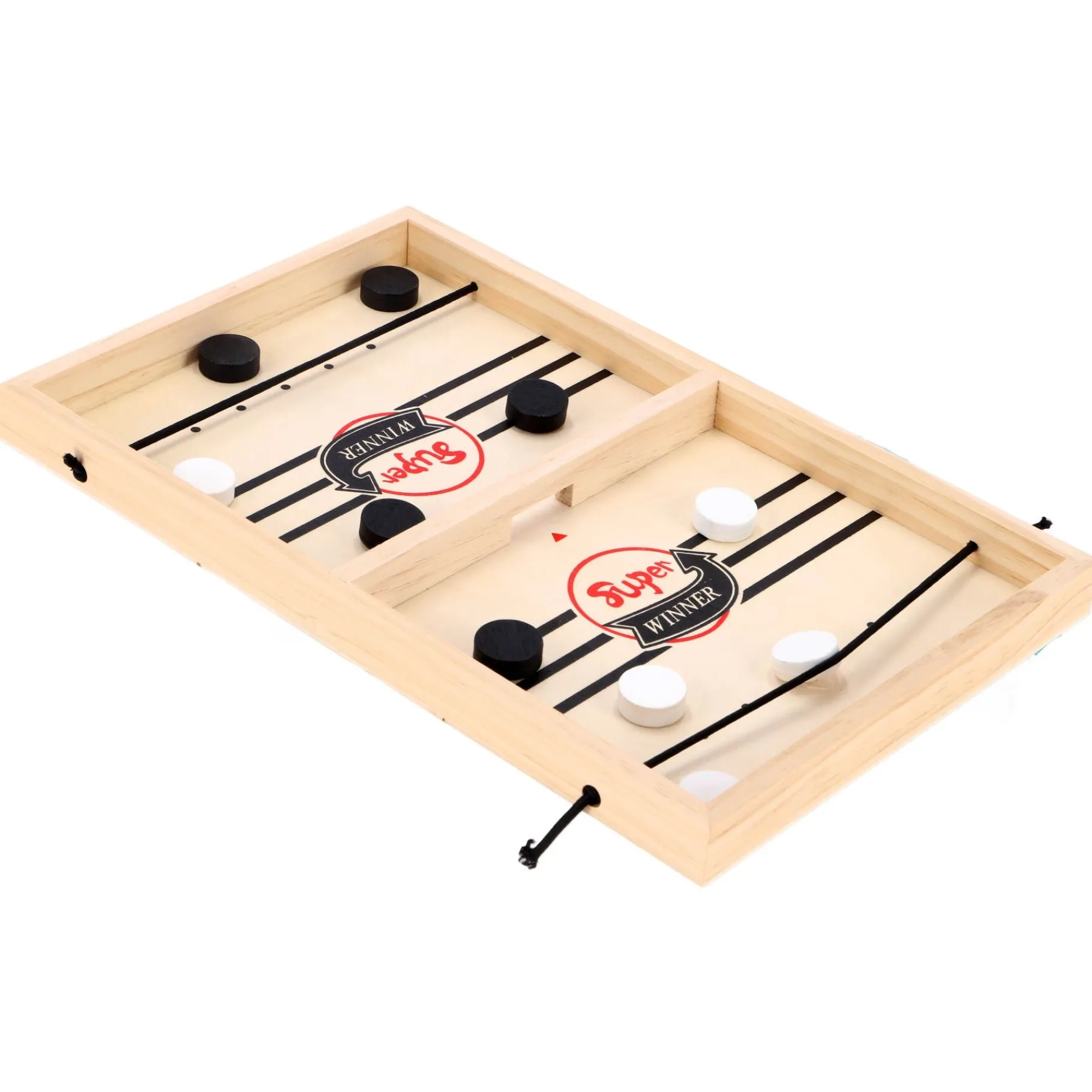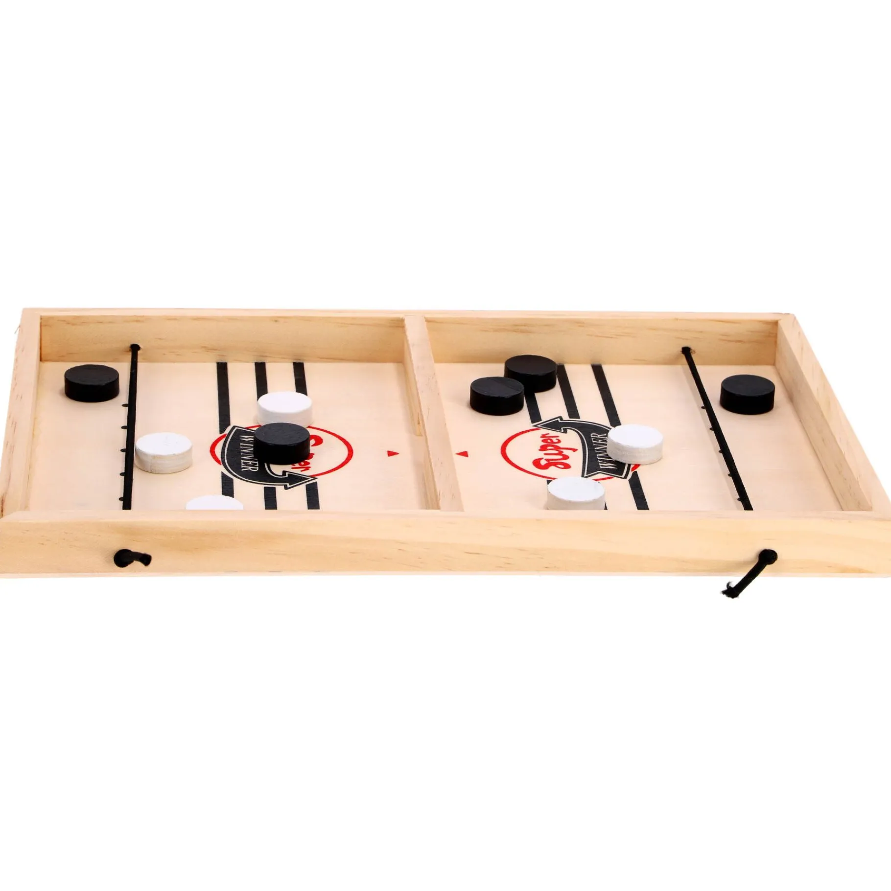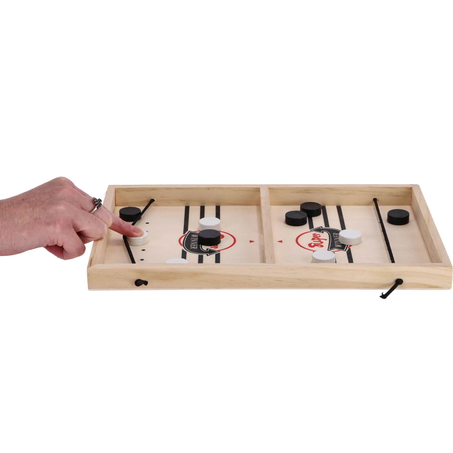 Dit spel wordt geleverd met een uniek speelbord vervaardigd uit duurzaam hout, dat twee doelen aan tegenovergestelde zijden van het bord heeft. Spelers gebruiken hun vingers om houten schijven over het bord te schuiven, waarbij ze proberen deze in het doel van de tegenstander te schieten. De speler die als eerste al zijn schijven in het doel van de tegenstander krijgt, wordt tot winnaar uitgeroepen.