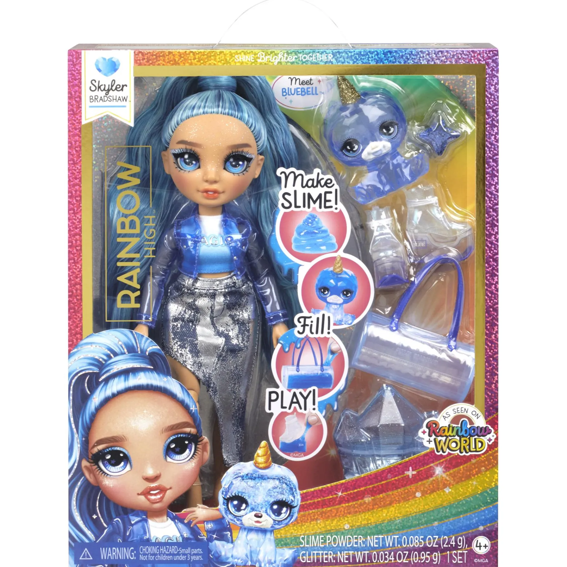 De mode-accessoires van Skyler Bradshaw, waaronder schattige schoenen en een tas, kunnen van kleur veranderen door wat slijm toe te voegen. Skyler straalt van top tot teen in het BLAUW, met glans en glinsteringen. Haar mode is gedetailleerd met schitterende accenten en ze heeft prachtig lang, blauw haar in een paardenstaart, lange wimpers en glazen ogen die magisch fonkelen.