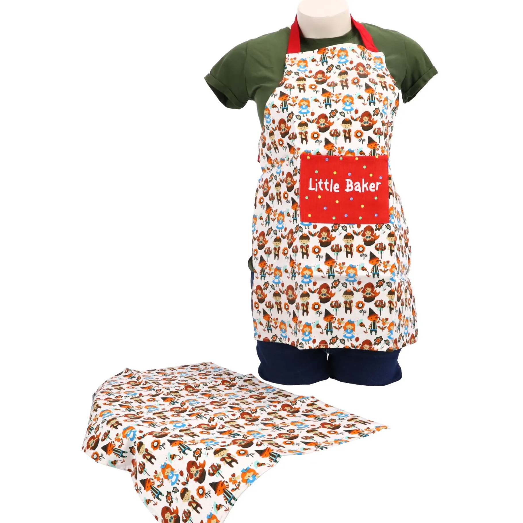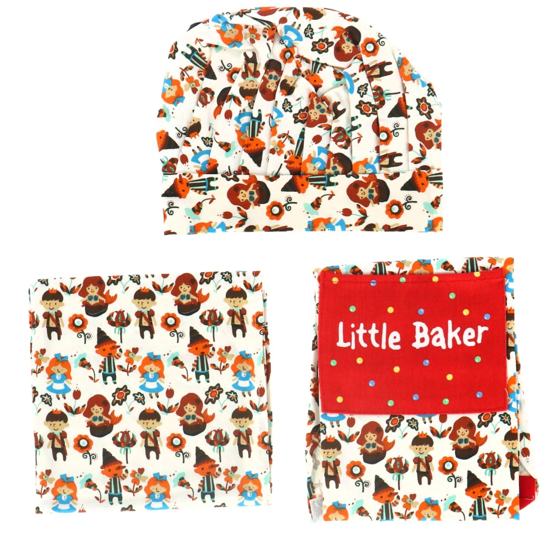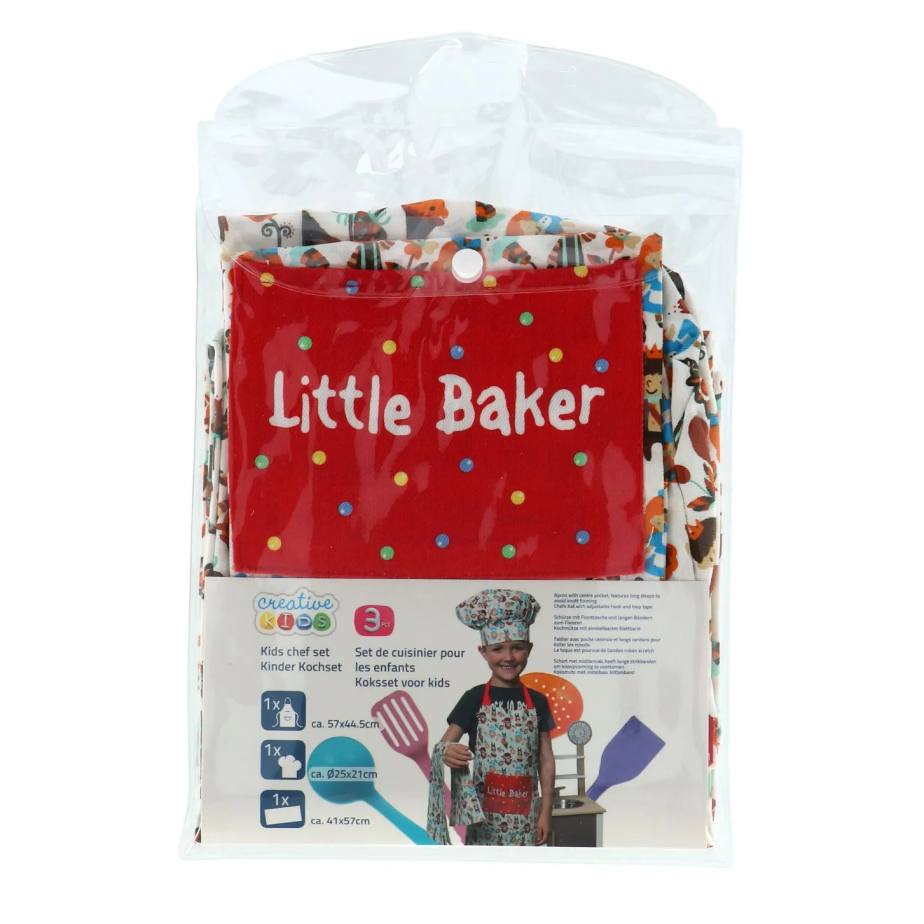 De koksmuts laat iedereen zien dat je een echte kok bent. Ook hier zit het kleurrijke patroon op, passend bij het schort. Je kunt de koksmuts sluiten met klitteband, zo kan je hem gemakkelijk op en af zetten. En wat natuulijk niet te missen is, is de keukendoek. Het kan soms best rommelig worden in de keuken, dus dan is het super handig dat je je keukendoek kunt gebruiken om alles netjes te houden.