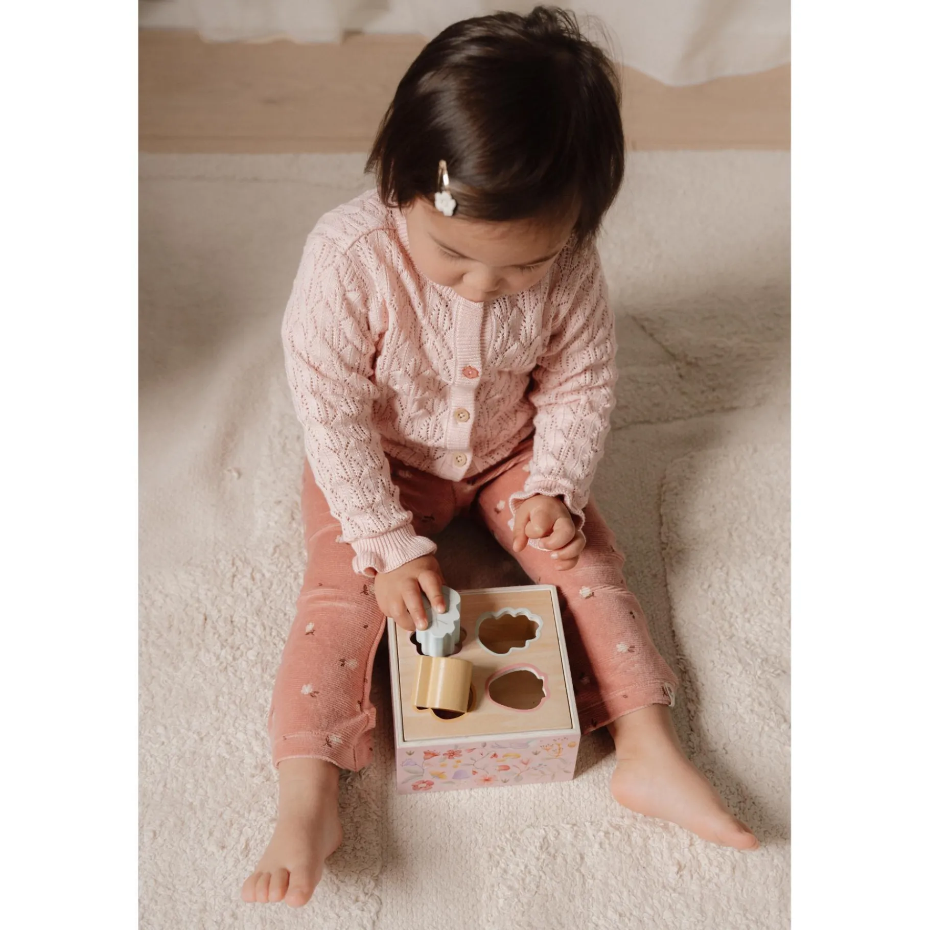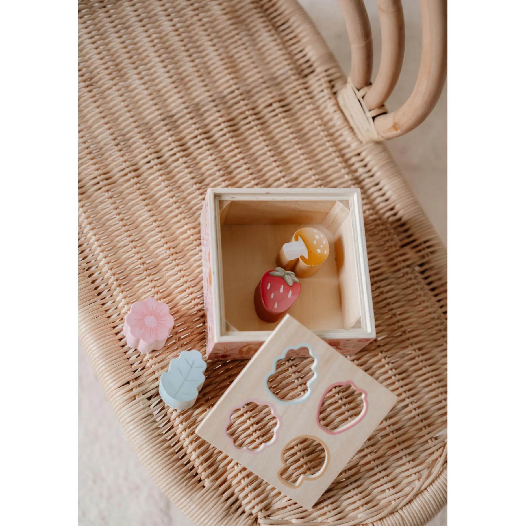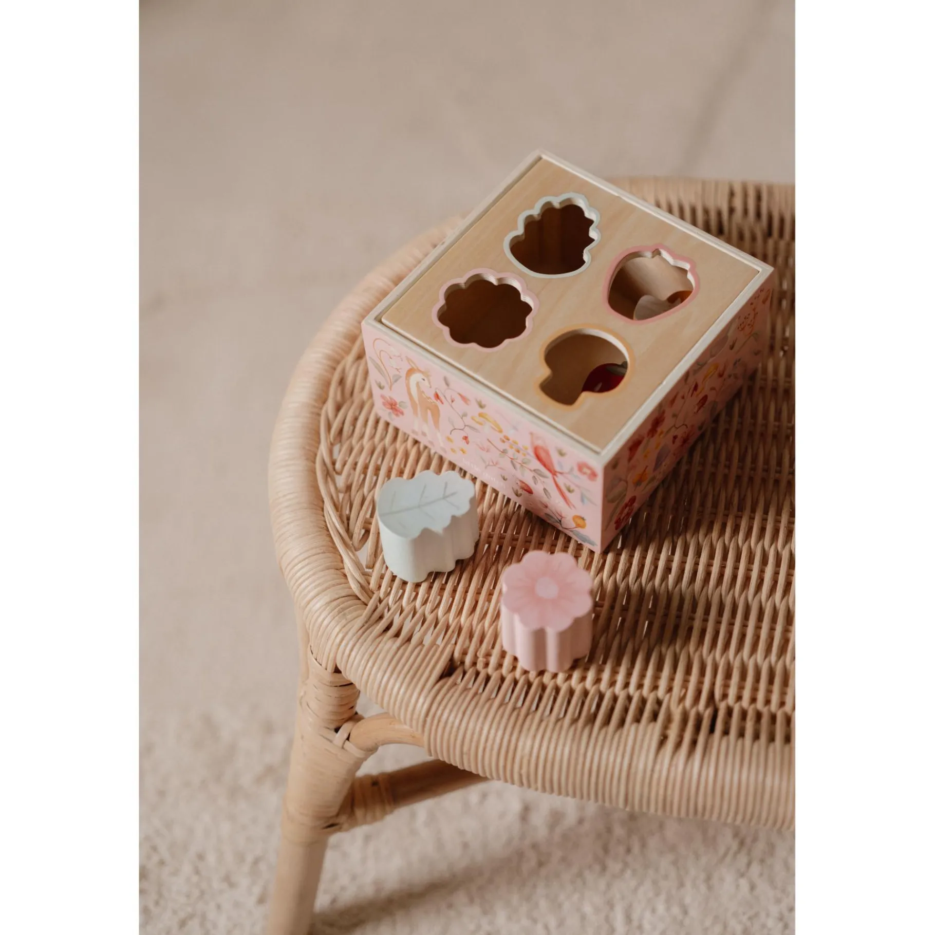 De vormenstoof bevat prachtige elementen die rechtstreeks uit een feeëntuin lijken te komen, met zachte pasteltinten en speelse details. Iedere keer dat een vorm door de juiste opening valt, ontstaat er een glimlach en groeit de nieuwsgierigheid om verder te ontdekken. Perfect om de verbeelding te prikkelen en spelenderwijs te leren!