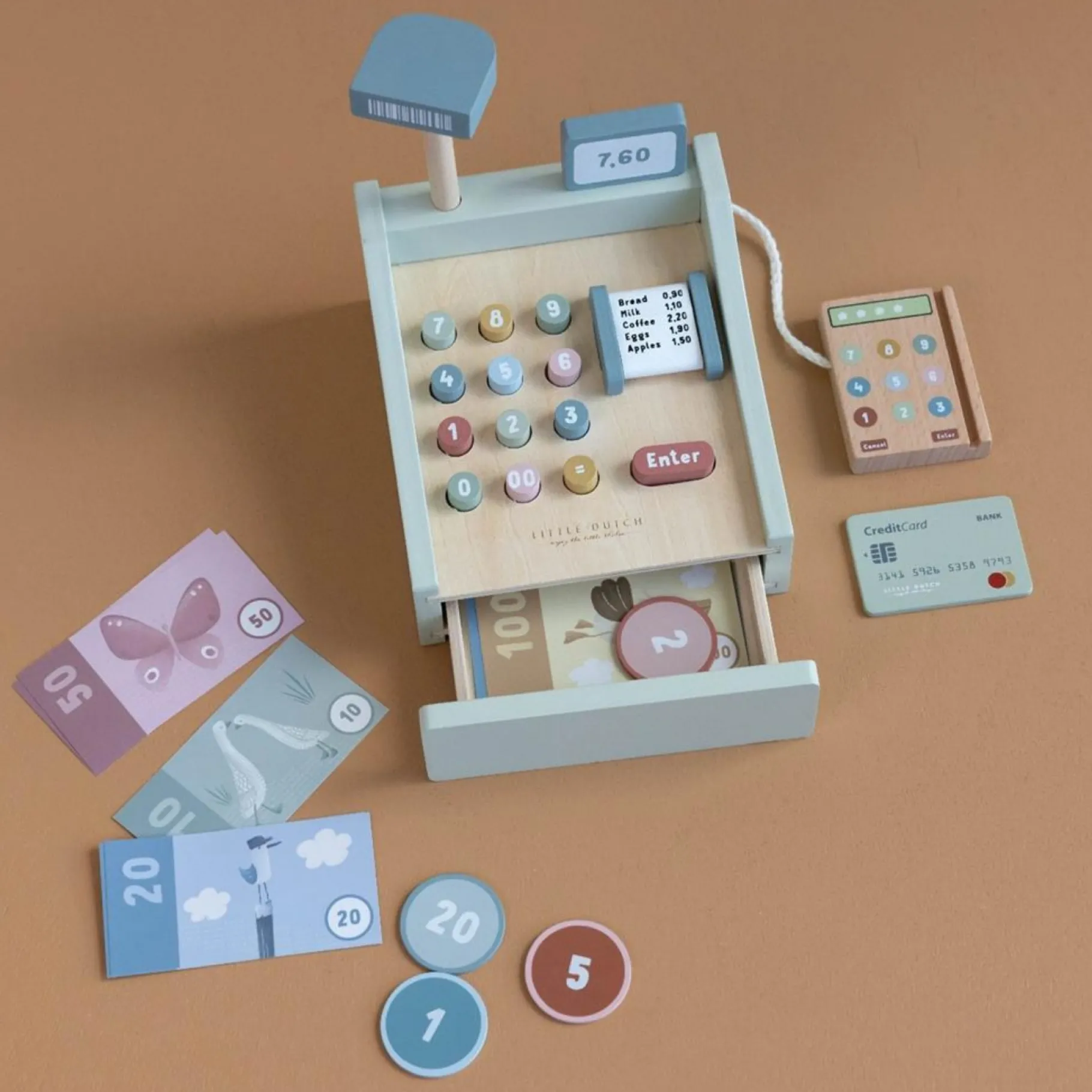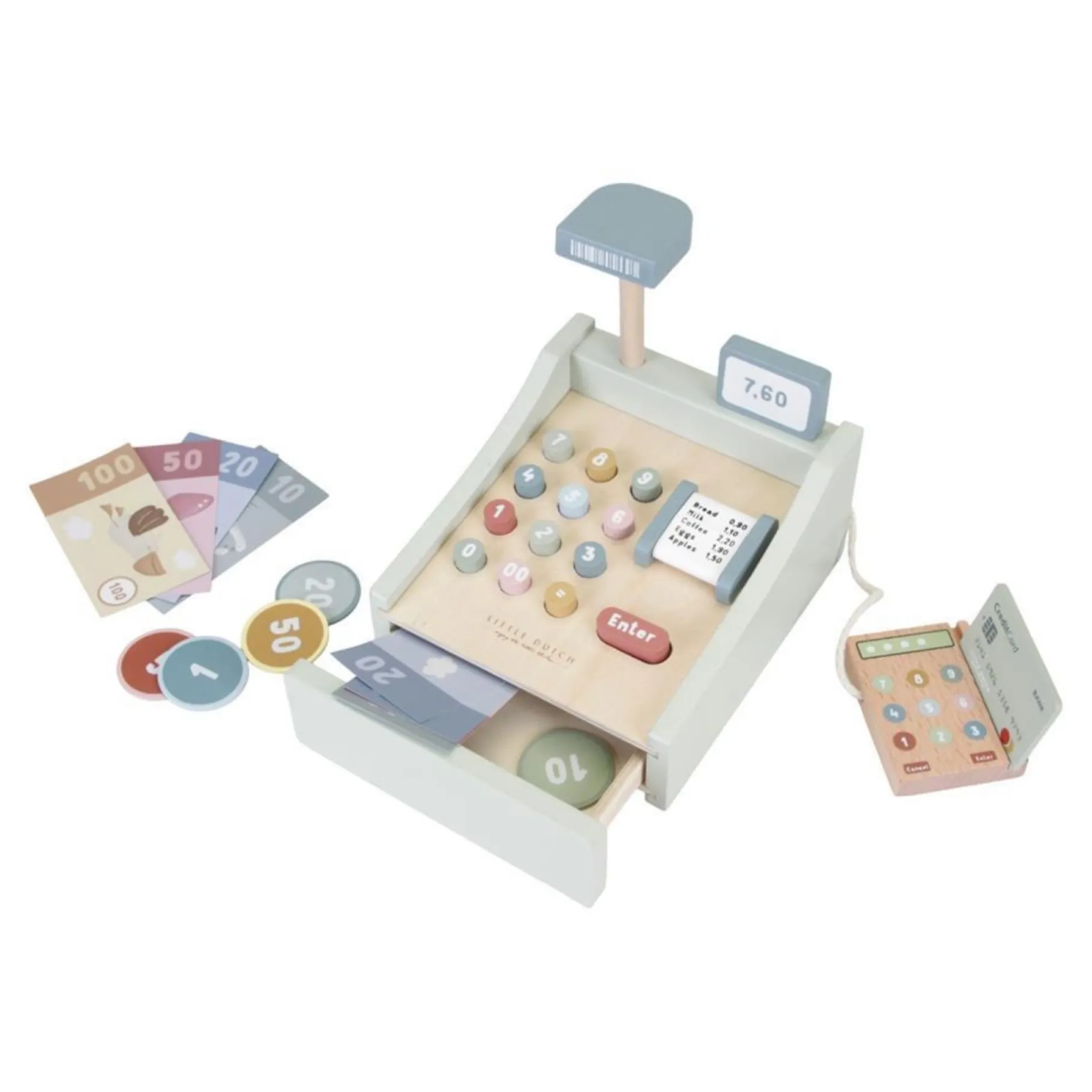 – Inhoud van de verpakking: 1 houten kassa met scanner, speelgeld, betaalautomaat en creditcard