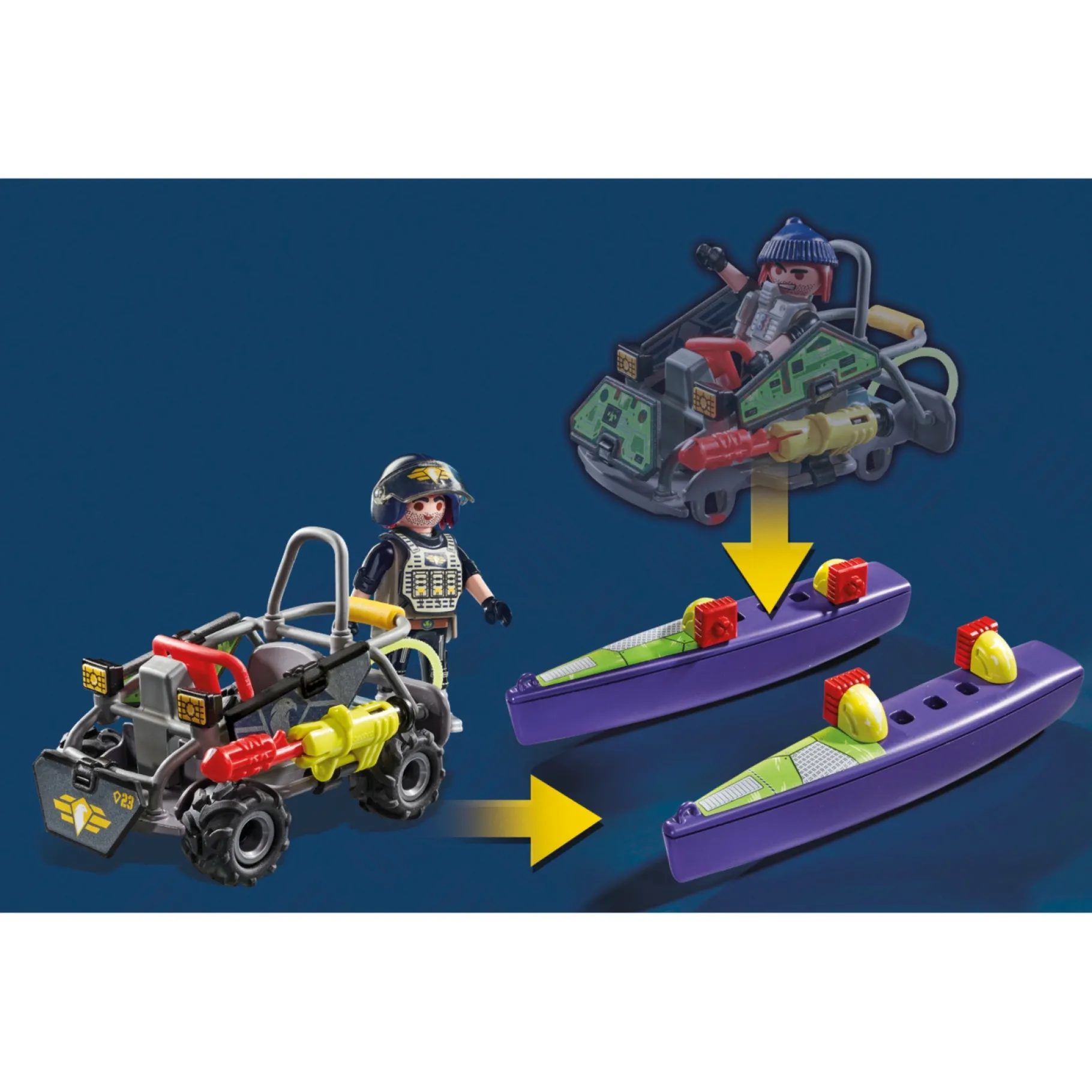 Met de PlayMobil 71147 City Action Multiterreinwagen kunnen kinderen hun eigen politie-avonturen creƫren. De set bevat een gedetailleerde politieagent en een krachtige multi-terreinwagen die is uitgerust om over elk terrein te navigeren. Of het nu door modderige paden, over ruig terrein of zelfs door water is, deze voertuigen kunnen het allemaal aan.