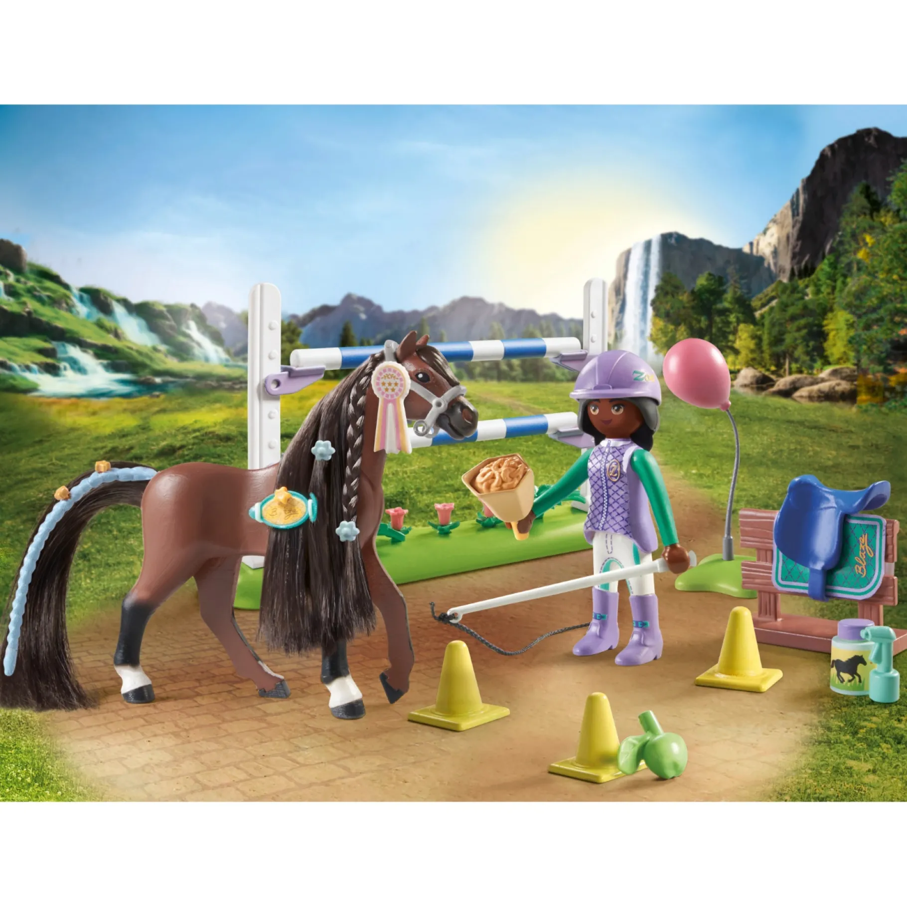 Het is interessant om te weten dat Zoe, hoewel ze het jongste lid is van de Luckyville Horse Academy, nooit een kans voorbij laat gaan om te trainen op Waterfall Ranch met haar beste vrienden Amelia, Isabella, Ellie en Ben. De pittoreske Waterfall Ranch, gelegen in het hart van de nieuwe paardenwereld van PLAYMOBIL, is de ideale omgeving voor hun avonturen. De ranch biedt de perfecte setting voor de vijf vrienden om hun liefde voor paarden te delen en samen spannende ervaringen te beleven. De set met Zoe en haar paard Blaze is een geweldig cadeau of aandenken voor jonge paardenliefhebbers vanaf 4 jaar. De set bevat talloze accessoires, waaronder een zadel, hoofdstel, teugels, haarklemmen en meer, waarmee kinderen hun eigen avonturen kunnen creëren en hun verbeelding de vrije loop kunnen laten.