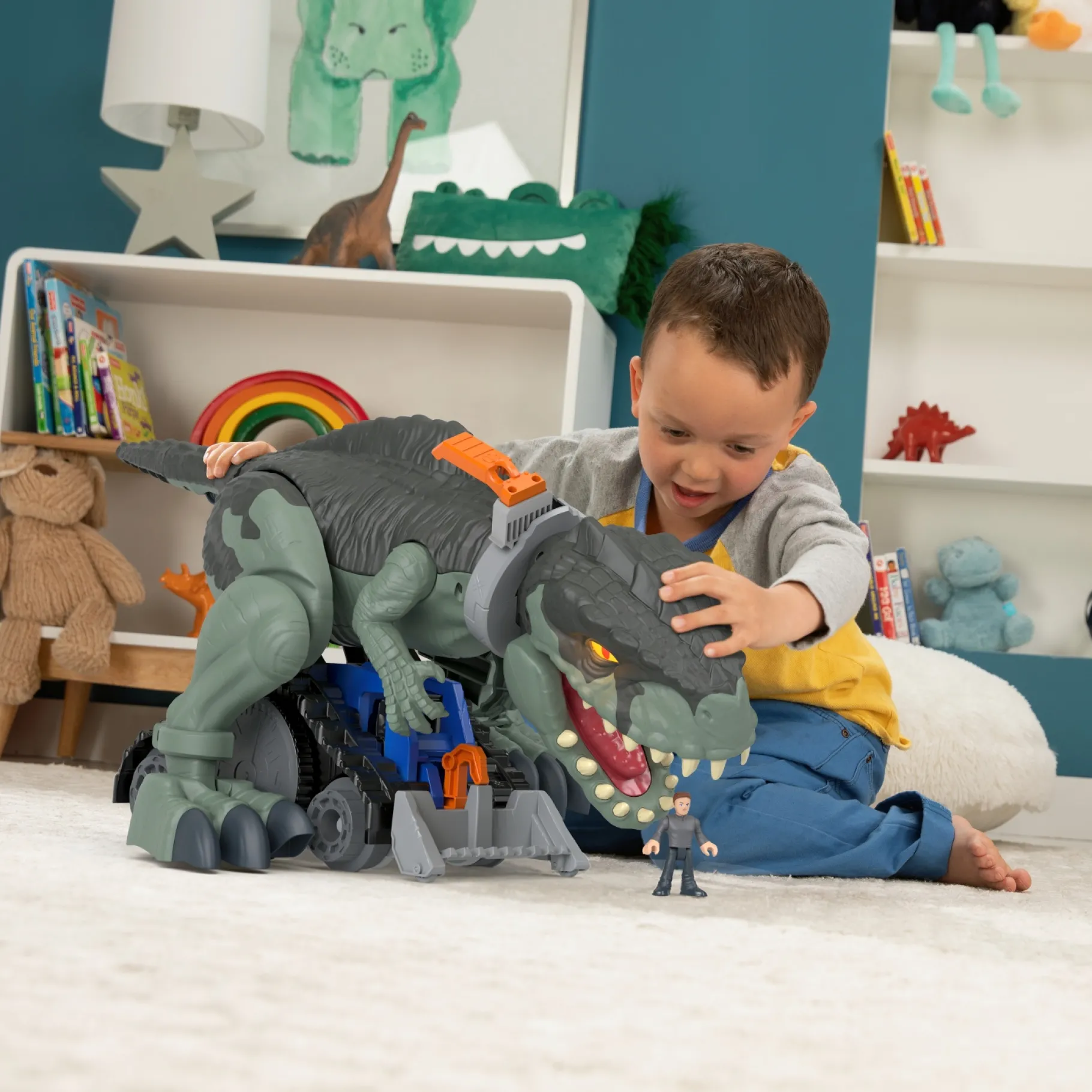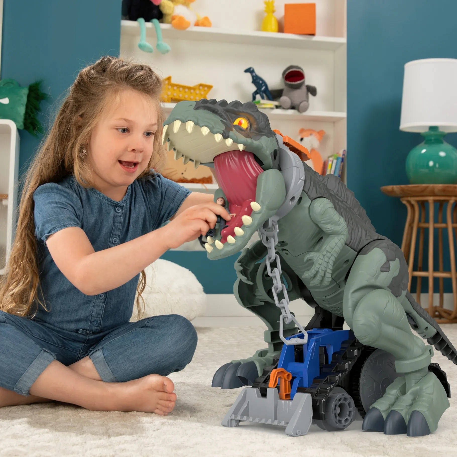 Draai zijn staart voor stoere hoofdschuddende bewegingen en duw hem vooruit om realistische geluiden te genereren terwijl hij stampt. Bevestig de ketting aan de poten of de nekband van de dino en kijk hoe hij losbreekt door te stampen en te slaan.