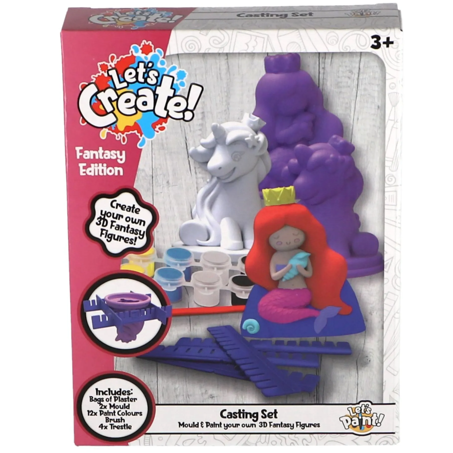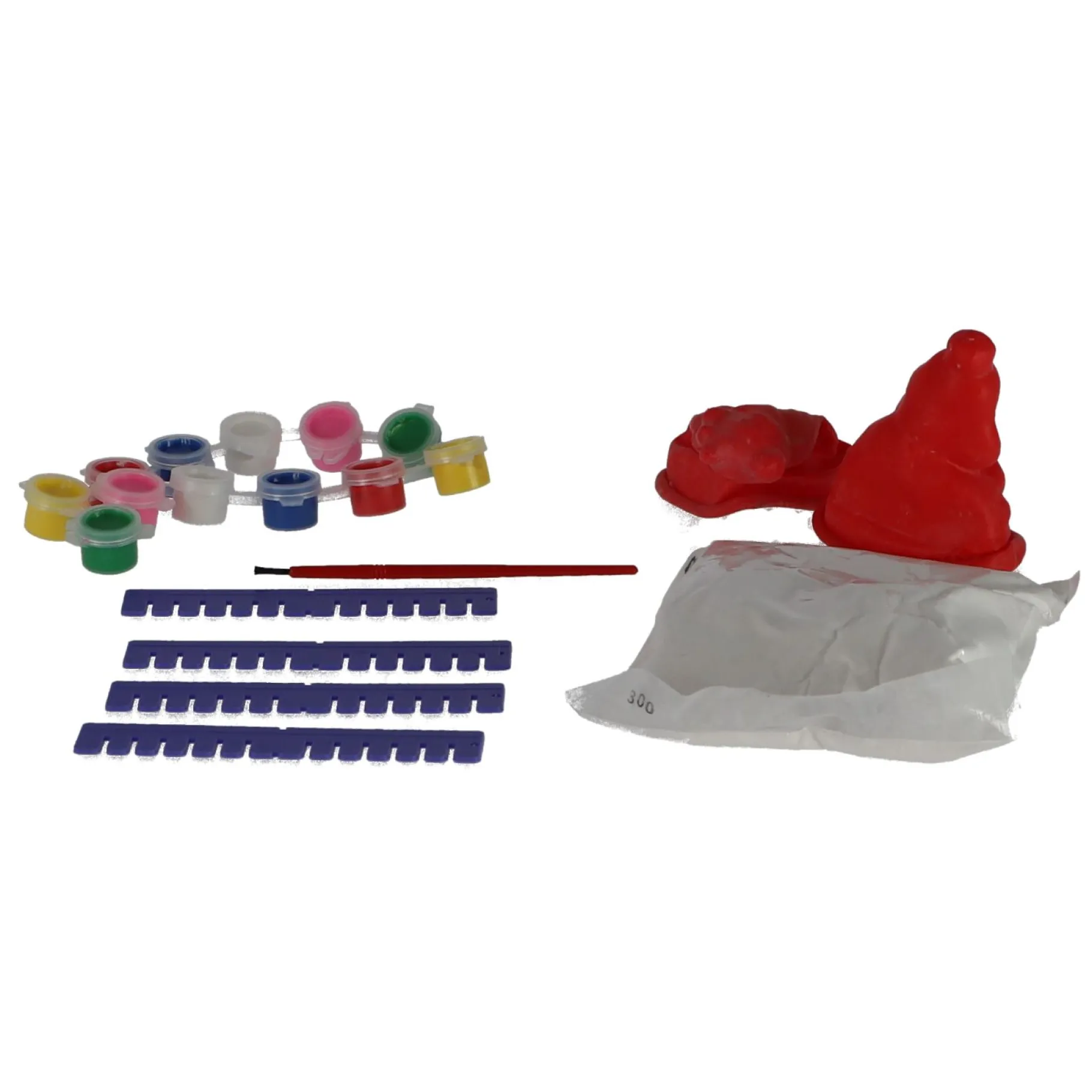 Inhoud: zakjes gips, 2 mallen, 12 kleuren verf, verfkwast, en 4 houders.