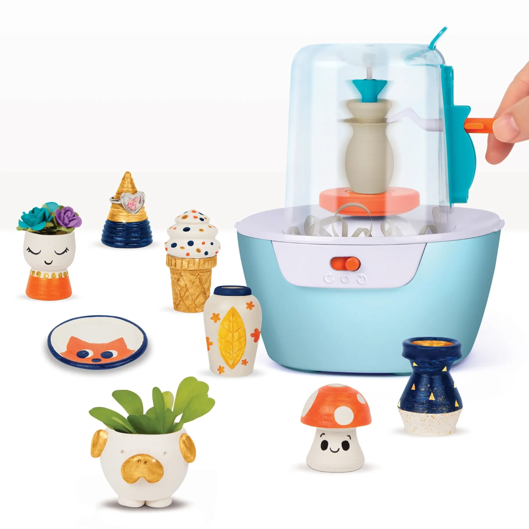In deze set vind je een assortiment tools, sjablonen en uitgebreide instructies om de leukste voorwerpen te maken. Vorm de klei, plaats deze op de draaischijf, laat de schijf draaien en gebruik de tools om je gewenste vorm te creƫren. Geef je ontwerp de finishing touch met de bijgeleverde verf. Zelfs beginnende pottenbakkers zullen versteld staan van het geweldige resultaat dat ze kunnen bereiken!
