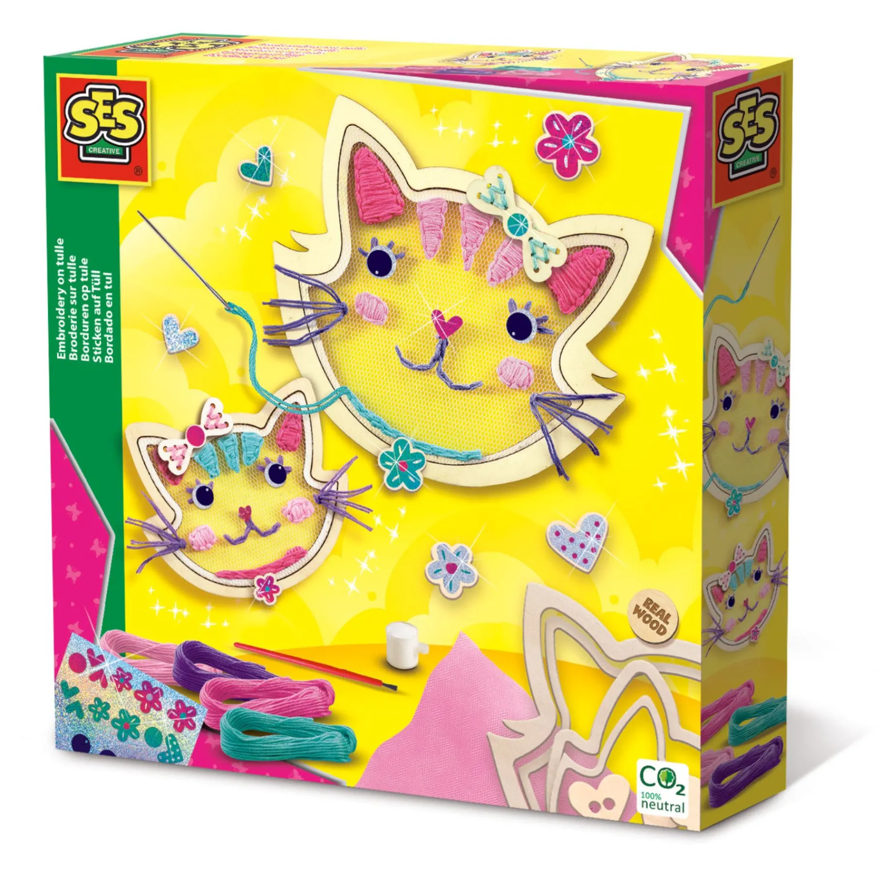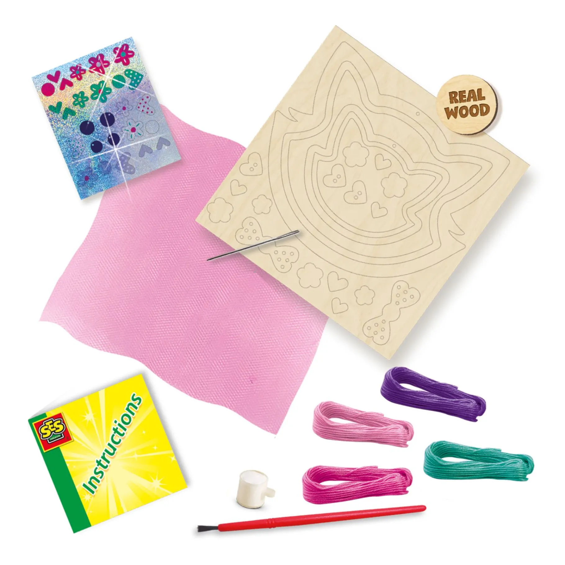 Het SES Creative Borduren op Tule-pakket bevat alles wat je nodig hebt om aan de slag te gaan: twee houten borduurringen in de vorm van katten, roze tule, een borduurnaald, lichtroze borduurgaren en glinsterende glitterstickers. Het is de perfecte manier om een nieuwe ambachtelijke vaardigheid te leren terwijl je geniet van een ontspannende en plezierige activiteit.