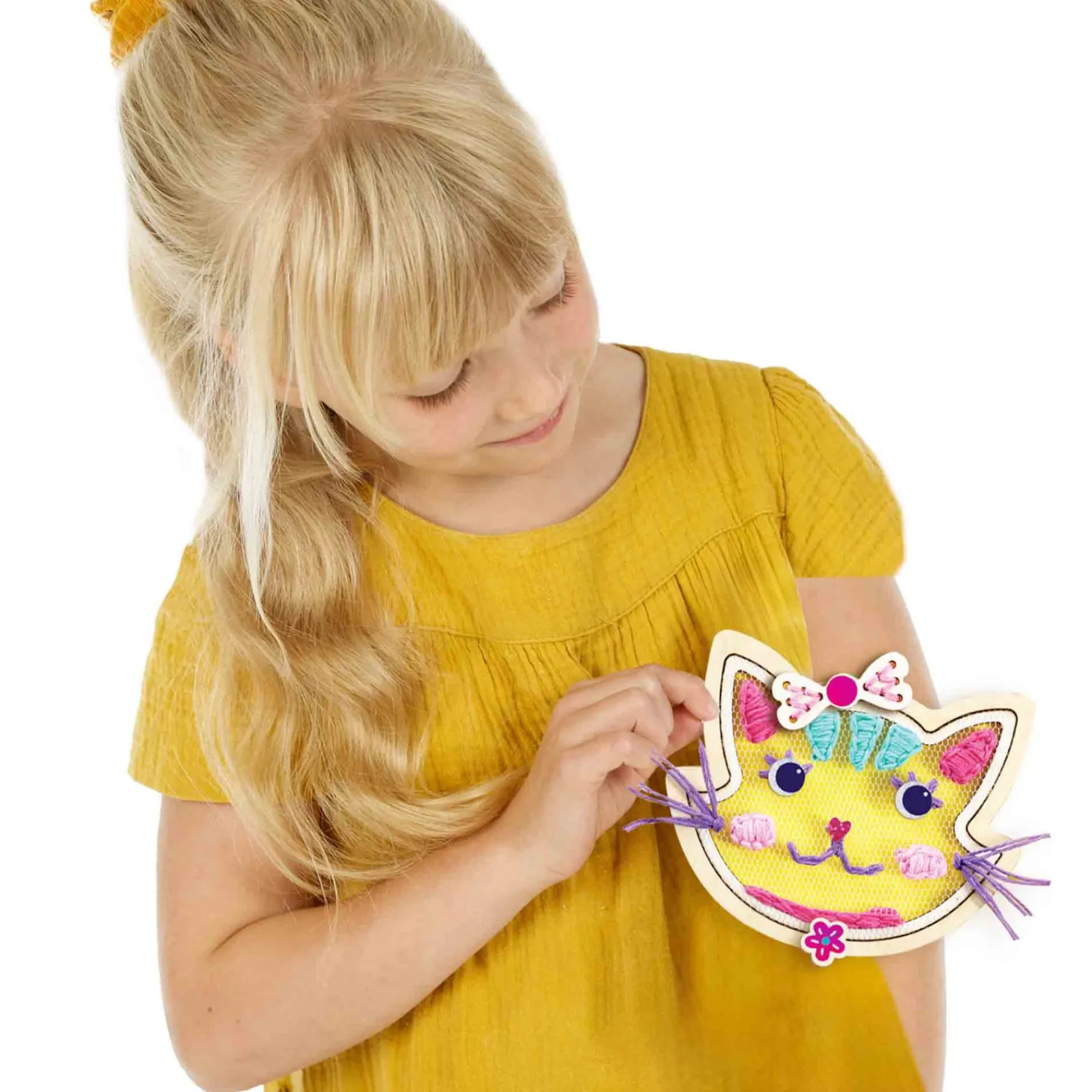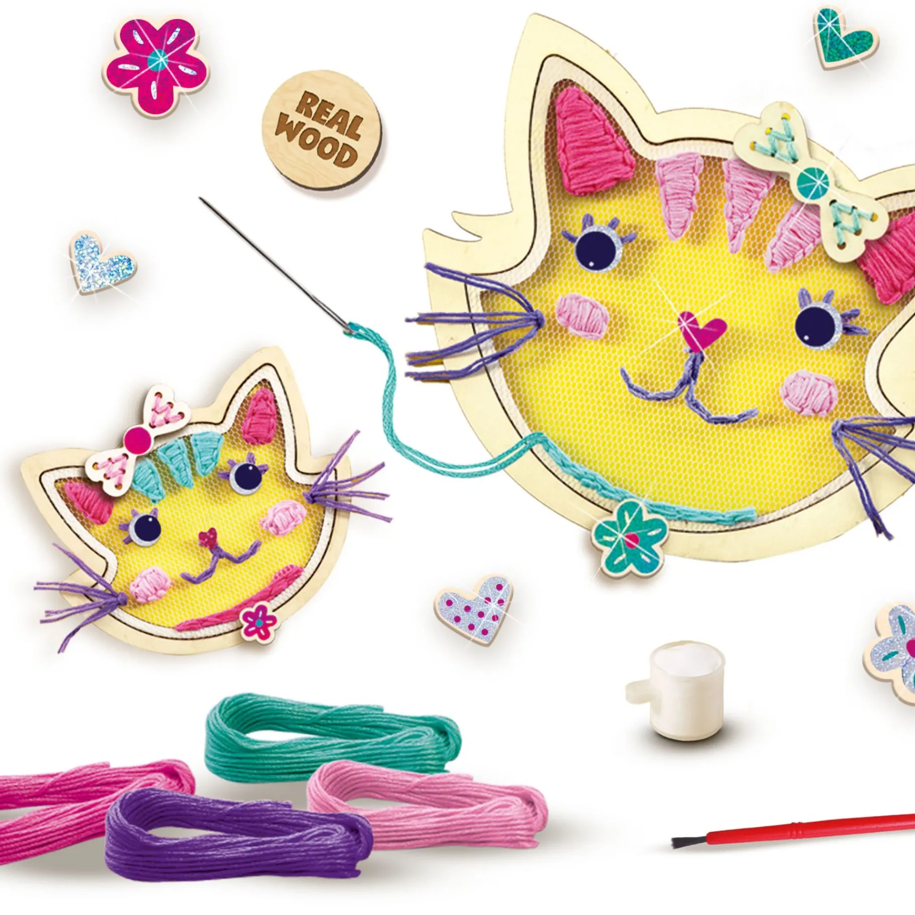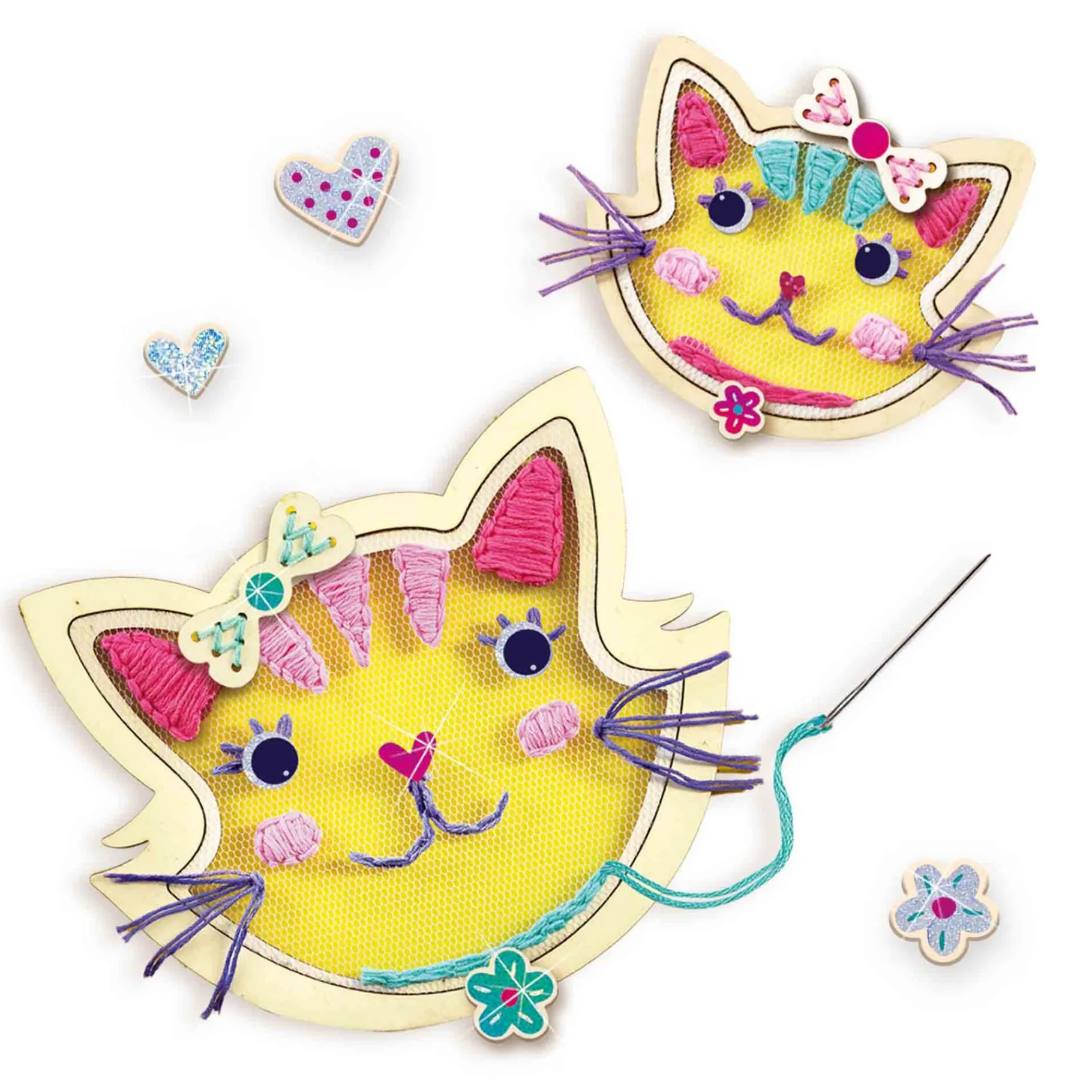 Verpakkinginhoud: 2 houten borduurringen in de vorm van katten; Roze tule; Borduurnaald; Lichtroze borduurgaren; Glinsterende glitterstickers.