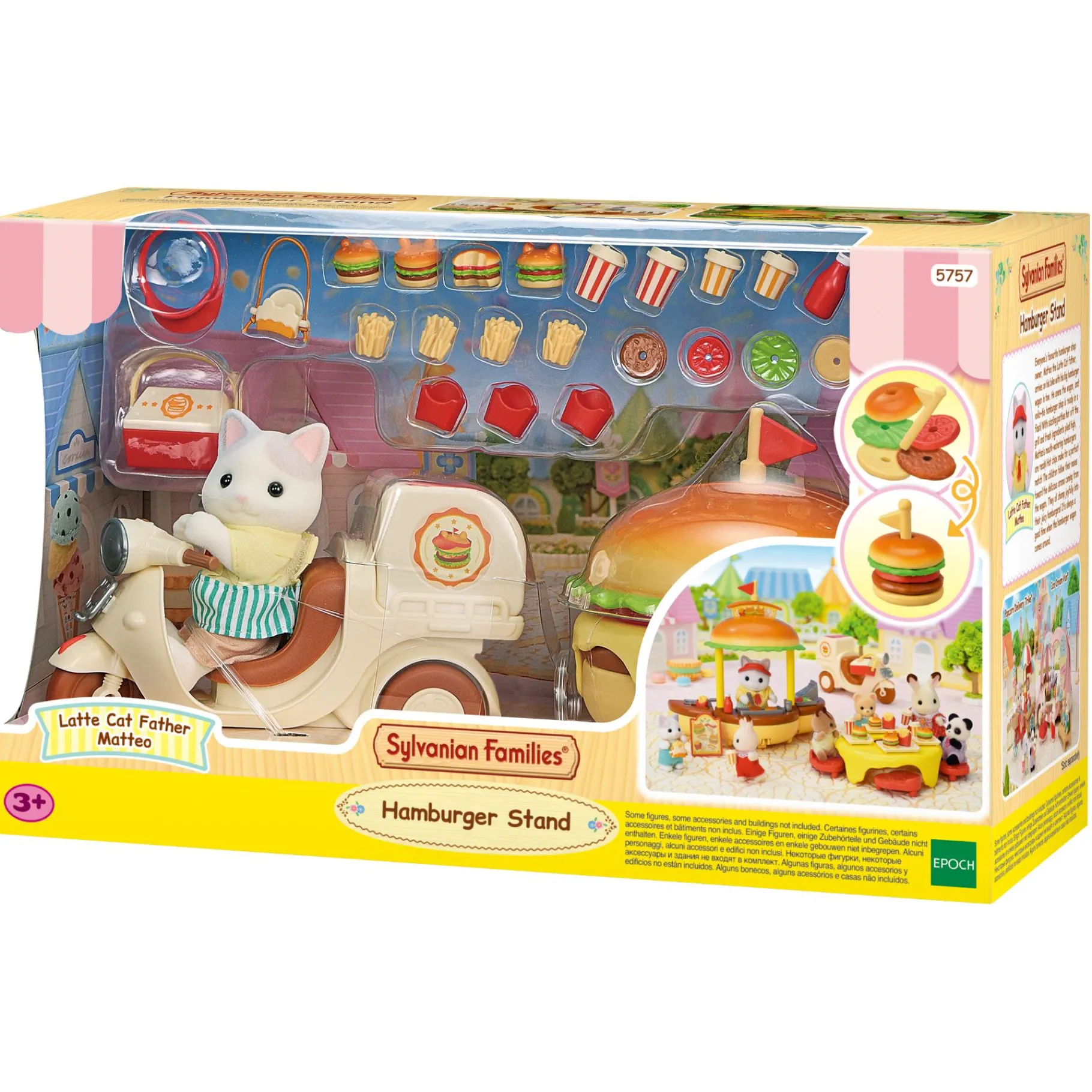 Ontdek de wereld van Sylvanian Families met deze schattige Hamburgerstand (5757)! De set bevat een schattige katfiguur die rondrijdt op een hamburger scooter, compleet met een bijpassende hamburger aanhanger. Perfect voor rollenspellen en fantasierijke avonturen.