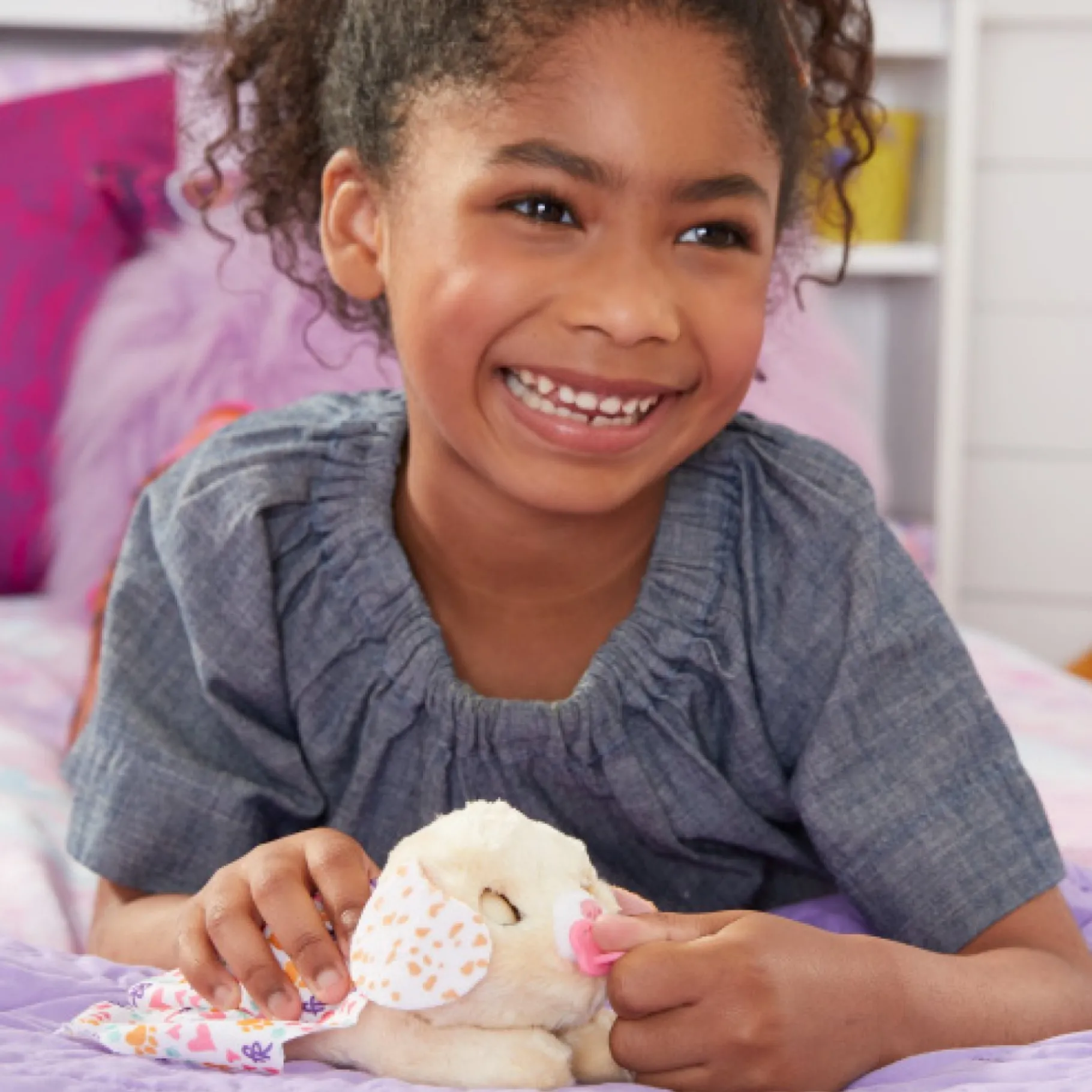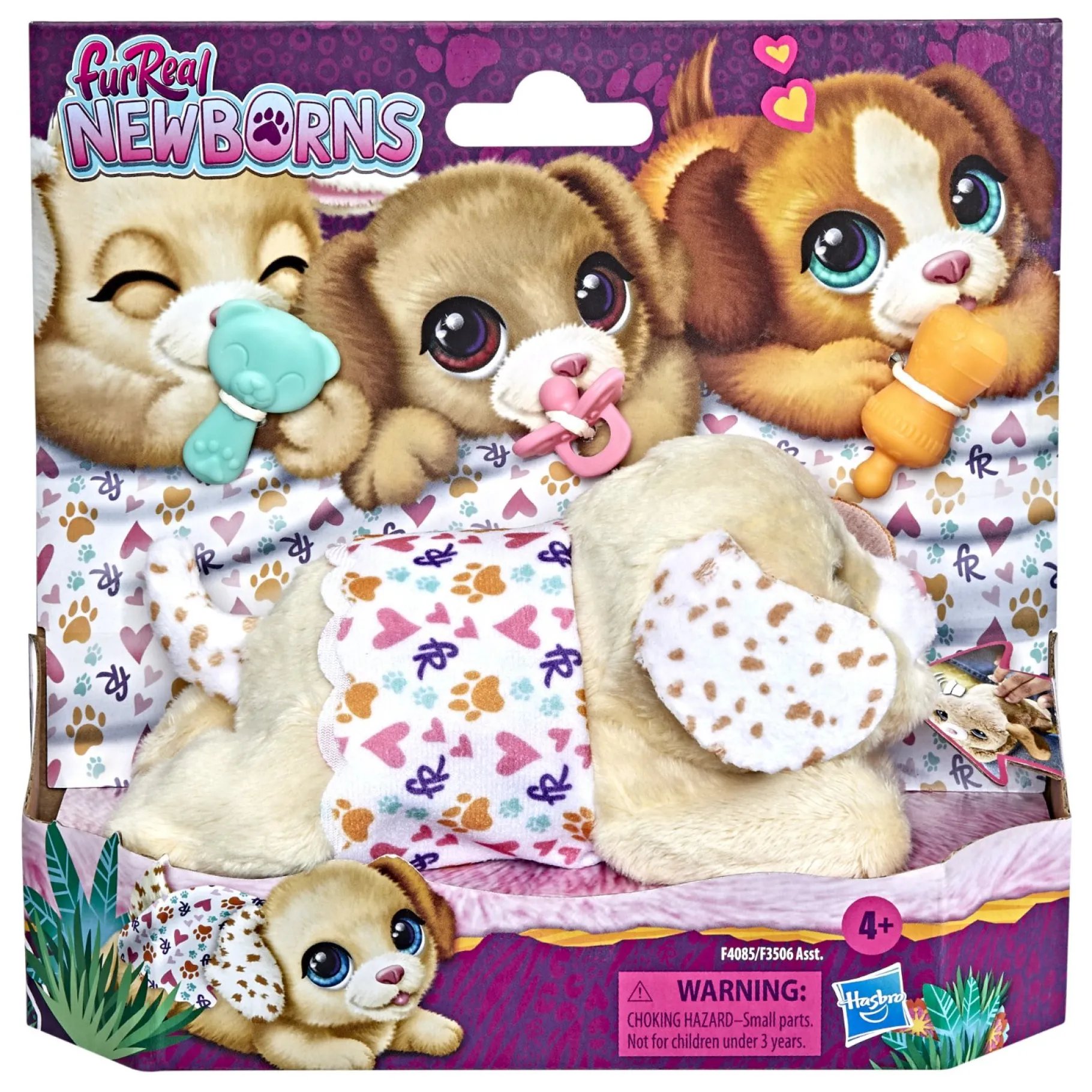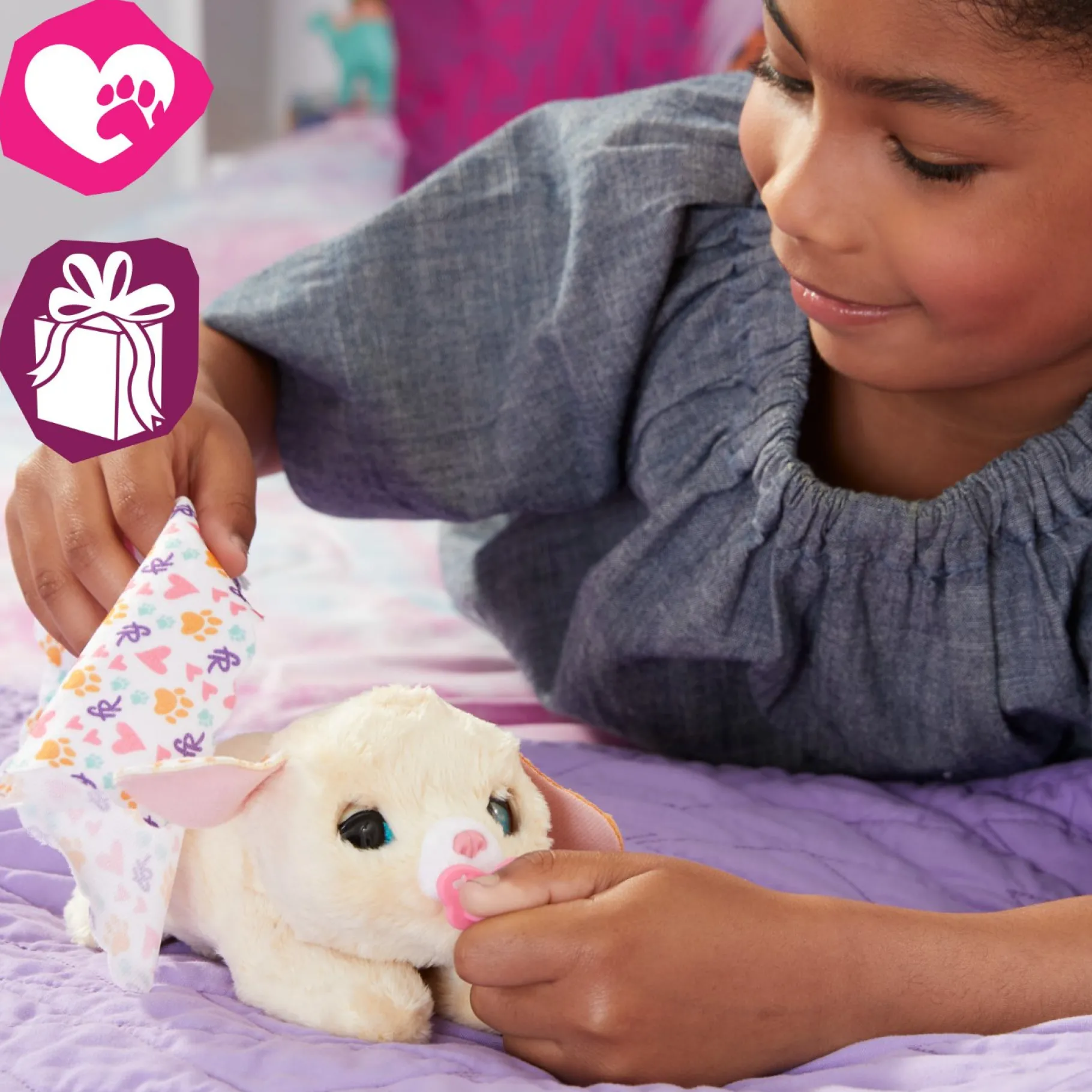 Het bevat 4 accessoires die de kinderen kunnen gebruiken om voor de puppy te zorgen. Als hij zijn fles of fopspeen krijgt, sluit hij zijn ogen en maakt hij blije, tevreden geluiden. Zelfs als zijn zachte vacht wordt geborsteld of zijn hoofd wordt geaaid, kalmeert het hem enorm. Het wordt ook geleverd met een kleedje om het mee in te pakken. Is er iets fijners dan een knuffelige knuffel?