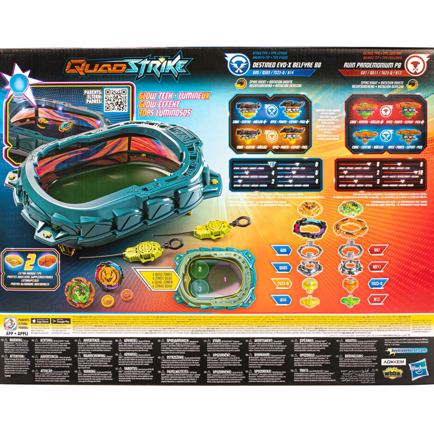 Elke set wordt afzonderlijk verkocht en is afhankelijk van beschikbaarheid. Als kers op de taart kun je de code op de QuadStrike-tops scannen en het gevecht voortzetten in de Beyblade Burst-app! Beyblade-speelgoed en 4-in-1 aanpasbare draaitops zijn geweldige cadeaus voor kinderen, perfect voor jongens en meisjes vanaf 8 jaar en ouder. Breng spanning, actie en kleur in je speelwereld met de Light Ignite Battle Set!