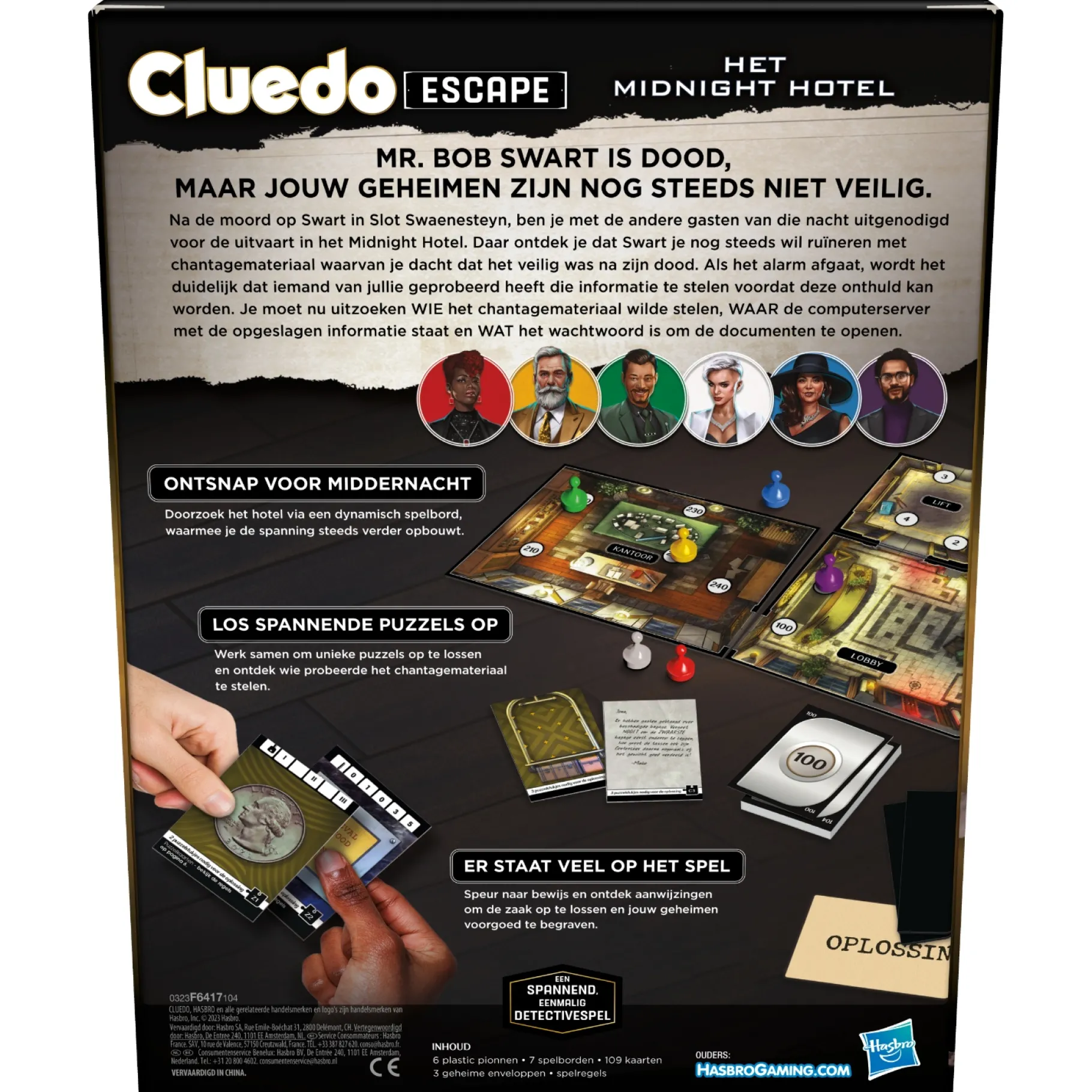 Nu is het aan jou en je medespelers om het mysterie op te lossen. Ontdek WIE er probeerde het chantagemateriaal te bemachtigen, WAAR het verborgen is en ontrafel WAT het wachtwoord is om de bestanden te openen. Cluedo Escape: Het Midnight Hotel combineert de geliefde Cluedo-personages en het meeslepende verhaal met de uitdagingen van een escape room-spel. En het beste van alles? Je kunt het snel opzetten en spelen met minimale voorbereiding!