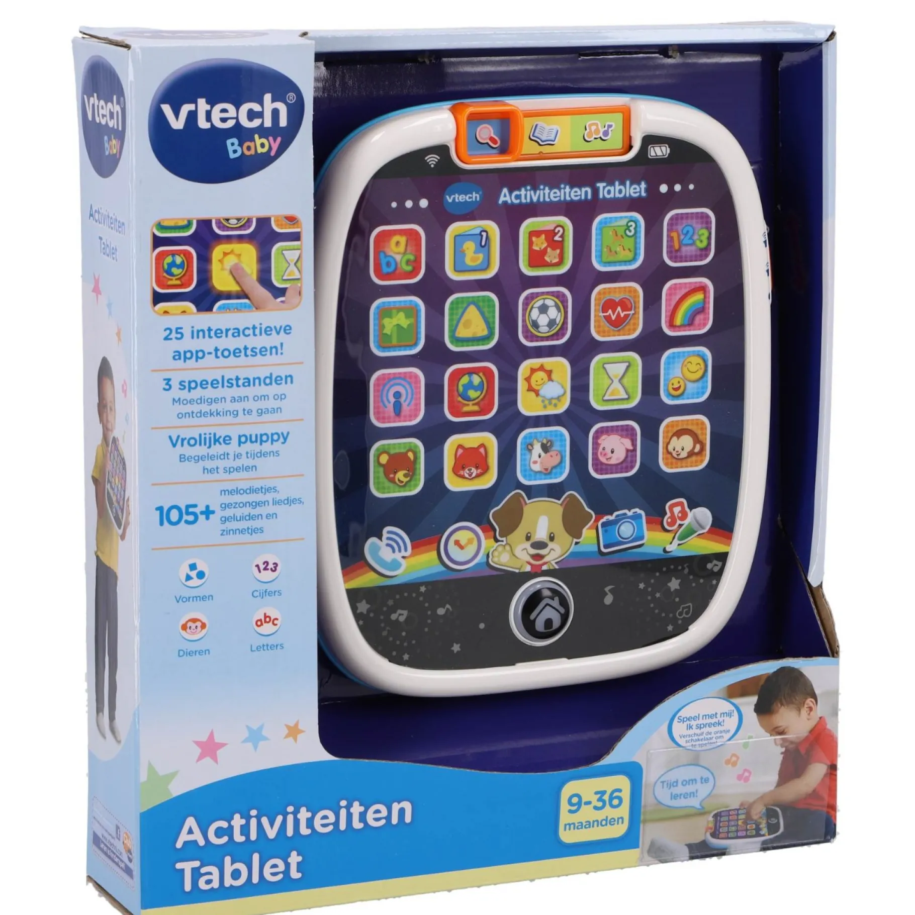 Dé educatieve tablet voor de allerkleinsten! Raak de 25 interactieve app-toetsen aan om kennis te maken met kleuren, vormen, dieren en nog veel meer! Luister naar muziek en korte verhaaltjes, ‘bel’ een vriendje en leer interessante weetjes. De lieve puppy zingt drie vrolijke liedjes en begeleidt je tijdens het spelen.