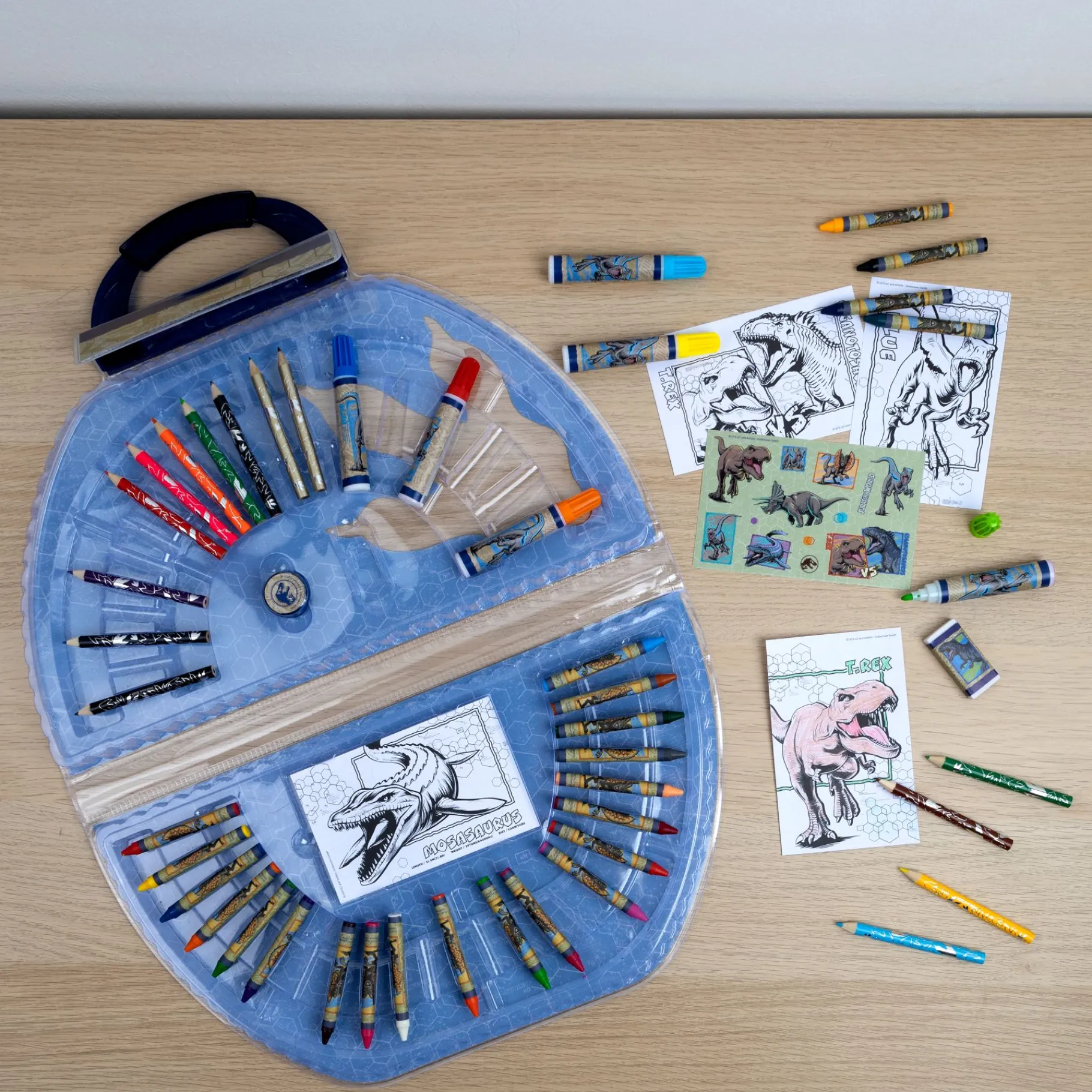De kleurkoffer bevat 51 zorgvuldig geselecteerde kunstmaterialen, waaronder kleurpotloden, stiften, en markers, allemaal met een stoer Jurassic World-thema. Elk item in de set is ontworpen om de verbeelding van kinderen te prikkelen, met levendige kleuren en inspirerende ontwerpen die de spanning van het Jurassic World-universum vastleggen.