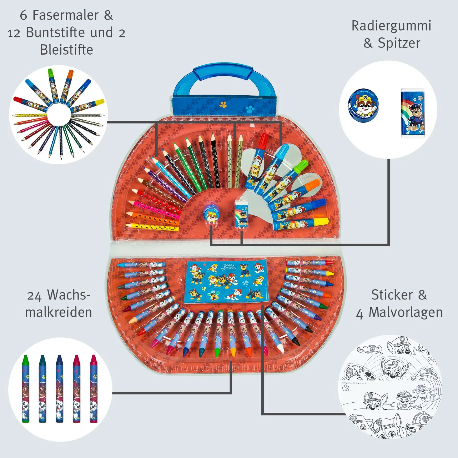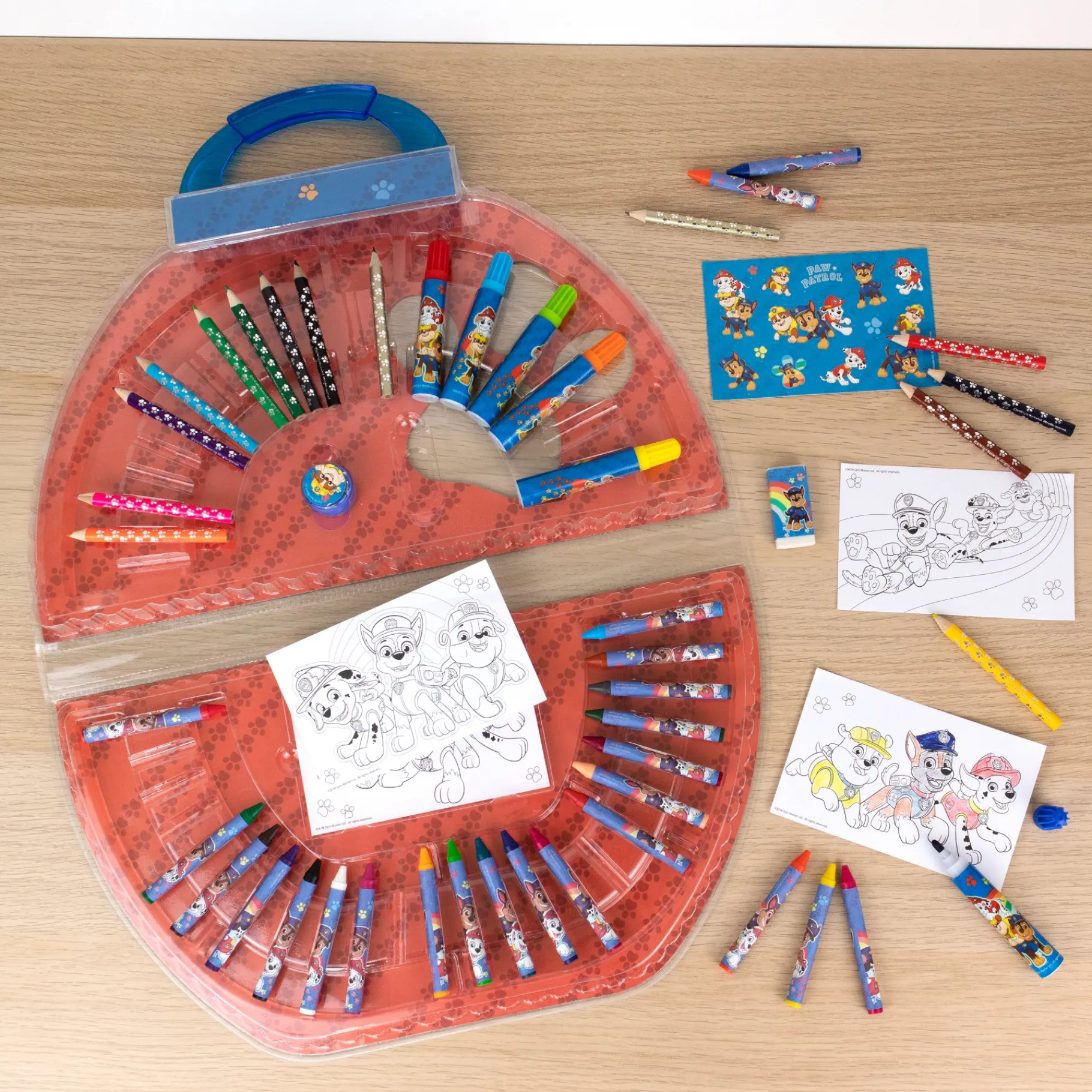De kleurkoffer is 51-delig en heeft kleurpotloden, stiften en krijtjes om de mooiste kleurplaten mee in te kleuren. Daarnaast heeft de koffer ook stickers om je tekening helemaal mee af te maken.