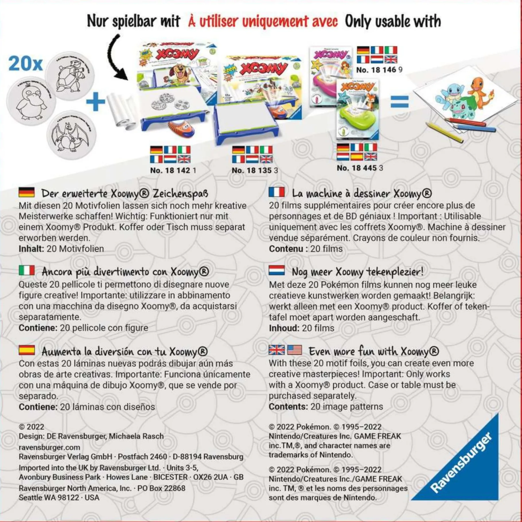 Elke film bevat afbeeldingen van verschillende Pokémon-personages, waardoor kinderen hun favoriete Pokémon kunnen tekenen en tot leven kunnen brengen. Met de Xoomy tekenset kunnen ze gemakkelijk de afbeeldingen vergroten en gedetailleerde kunstwerken maken.