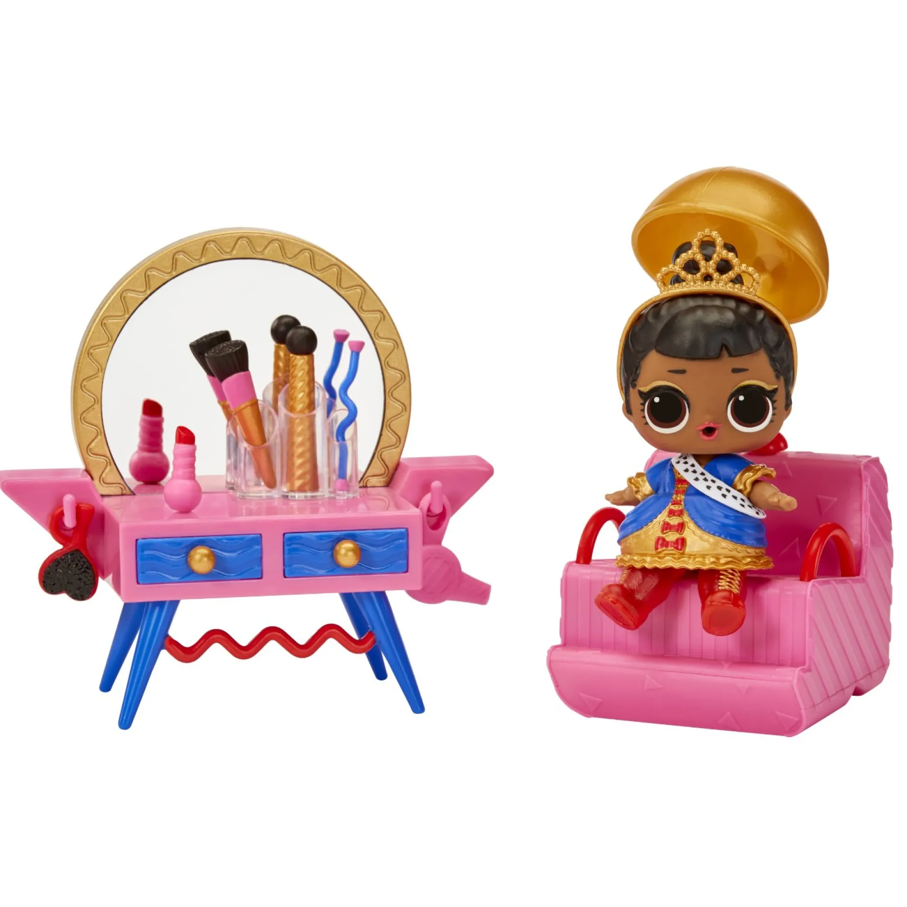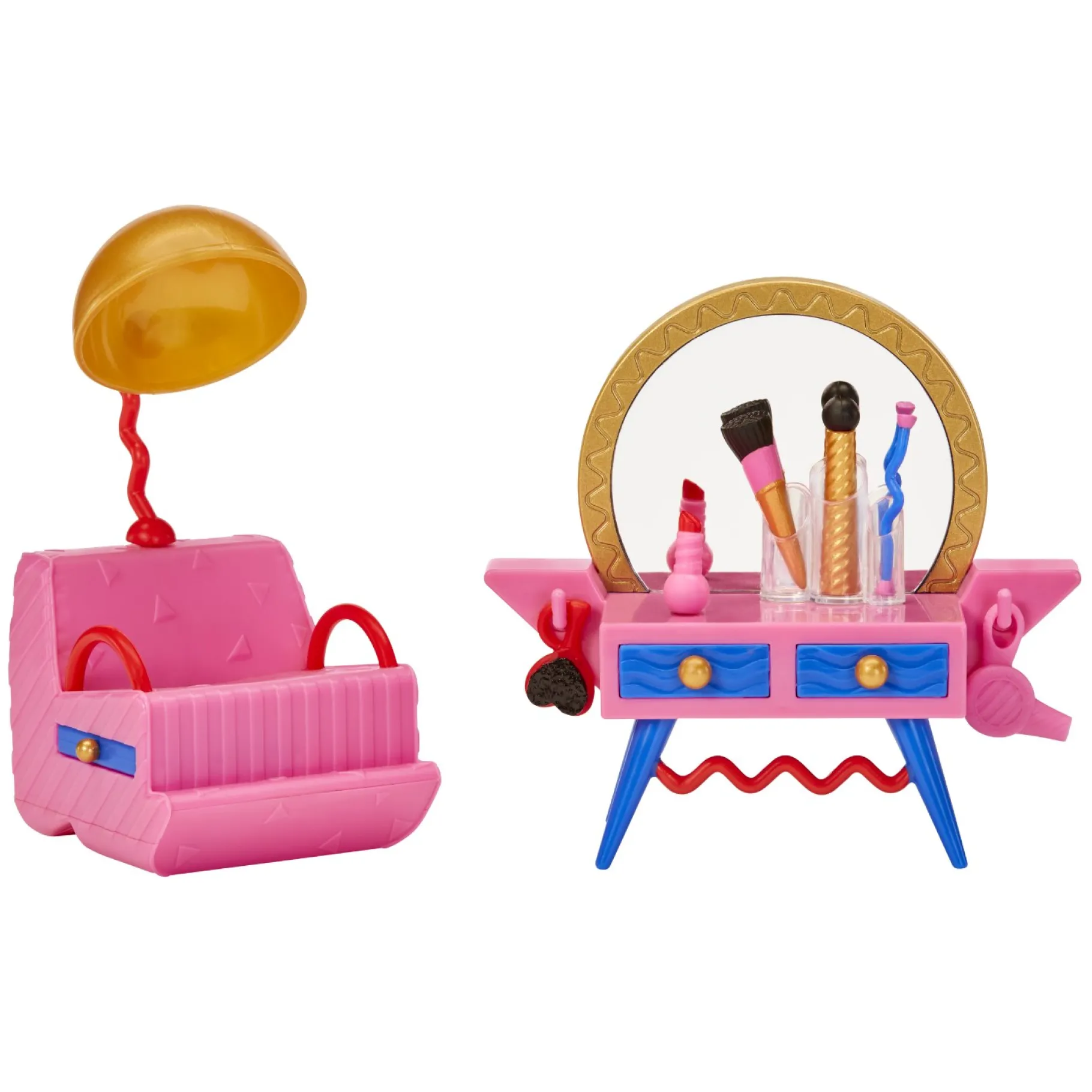 - Â PAK 8 VERRASSINGEN UIT waaronder een exclusieve pop, een kaptafel, een salonstoel, een haardroger, make-upkwasten, cosmetica, een make-updoos, een tiara, een haarborstel en een fles
