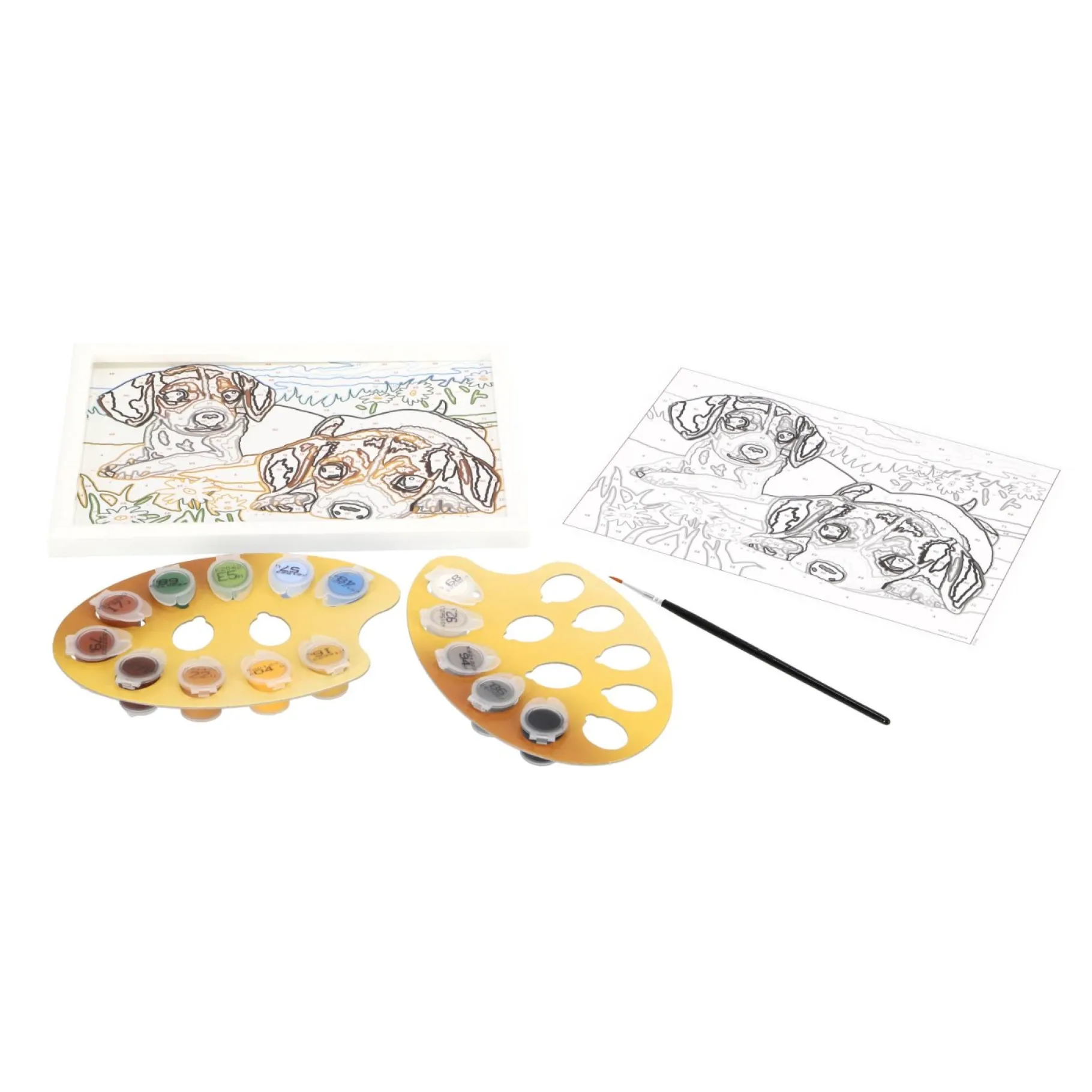 In de doos vind je alles wat je nodig hebt om een prachtig schilderij van twee Beagle puppies te maken. De set bevat een genummerd schilderij, een verfkwastje, 15 kleuren verf, een lijstje en duidelijke instructies. Volg eenvoudig de genummerde vlakken en zie hoe deze schattige Beagle Puppies tot leven komen op het doek.