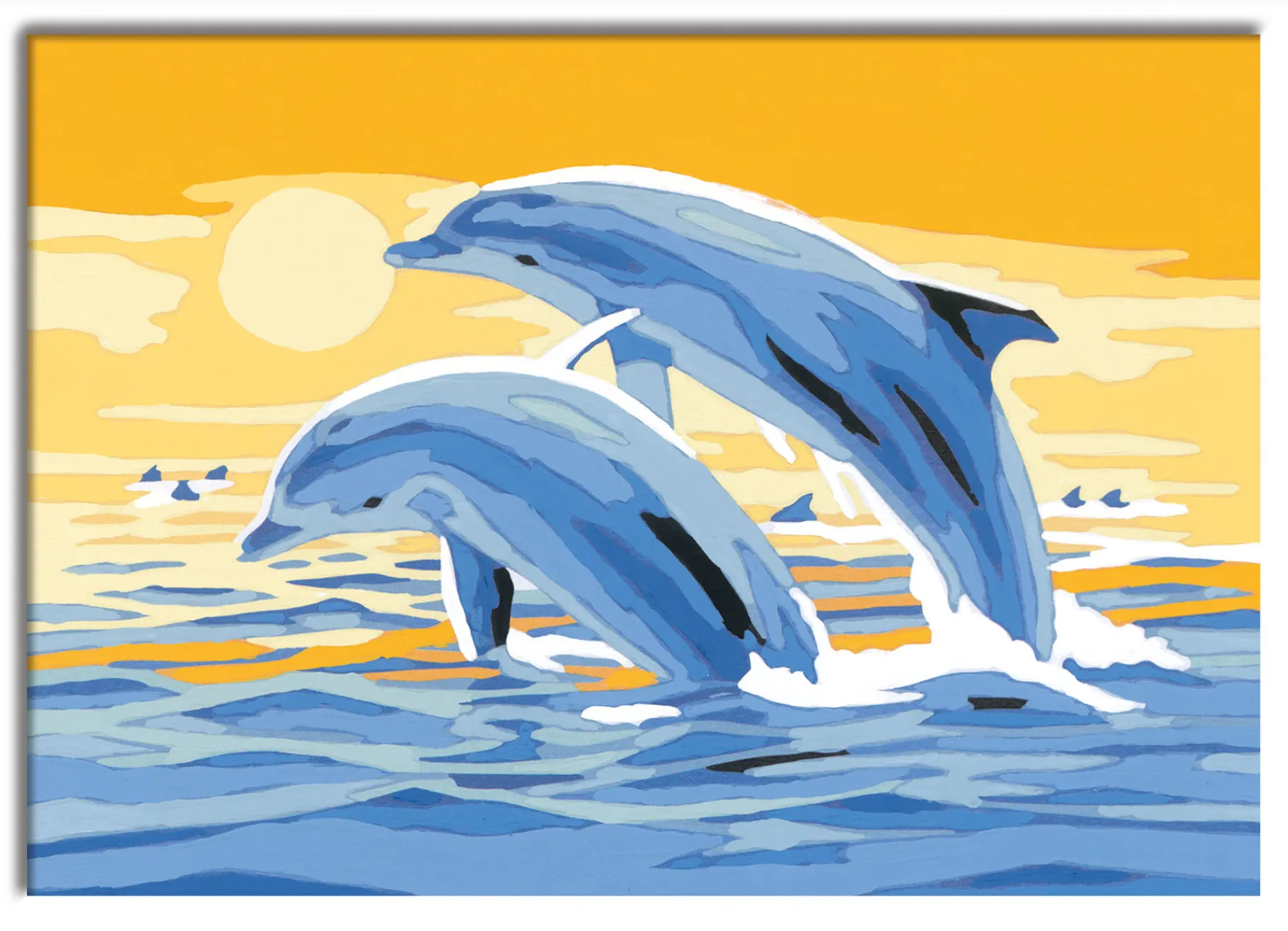 In de doos vind je alles wat je nodig hebt om een schilderij van 2 springende dolfijnen te maken, inclusief een genummerd schilderij, een verfkwastje, 10 kleuren verf, een lijstje en duidelijke instructies. Volg de genummerde vlakken en zie hoe het levendige kunstwerk zich ontvouwt.